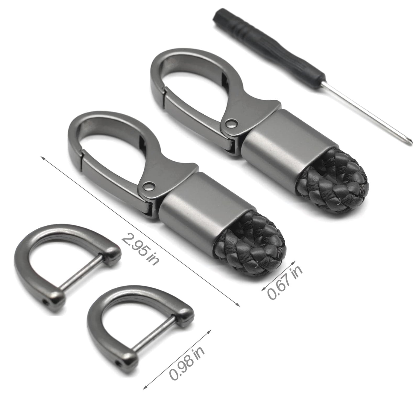 Performance: The rope is genuine leather weave, handy and with good texture. The metal part is made of zinc alloy polished, smooth surface, scratch-proof, rust-proof, durable Fix the key fob on the pants to prevent the keys from being lost. Exquisite workmanship, sturdy and elegant. A braided leather and metal keychain and detachable with 1pcs D ring. You can DIY, easily attach it to any other keys and better organize the keys. Package Included: 2 x Key Chain, Black Color 1 x Screwdriver