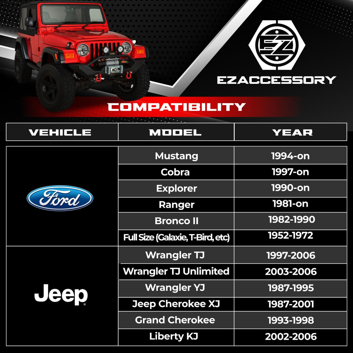 Q: What vehicles are compatible with the ezaccessory 2 Wheel Spacers Adapters?A: The ezaccessory 2 Wheel Spacers Adapters are compatible with a variety of vehicles including Ford Mustang (1994-on), Ford Cobra (1997-on), Ford Explorer (1990-on), Ford Ranger (1981-on), Ford Bronco II (1982-1990), Ford Full Size (Galaxie, T-Bird, etc. from 1952-1972), as well as several Jeep models such as Wrangler TJ (1997-2006), Wrangler TJ Unlimited (2003-2006), Wrangler YJ (1987-1995), Cherokee XJ (1987-2001), Grand Cherokee (1993-1998), and Liberty KJ (2002-2006).