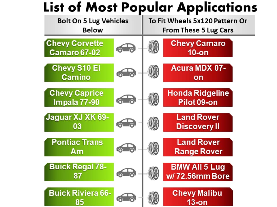 Product Information: The wheel adapter set is used to convert 5 lug 4.75-inch (120.7mm) hub bolt pattern to fit 5x120 bolt pattern wheels. They will also space out your wheels for 1-inch to help you get enough clearance for wider tires and rims. CNC machined with precision craftsmanship using 6061 T6 aerospace quality billet, featured in high load capacity and corrosion resistance. High quality studs are pre-installed and 14x1.5 thread size mounting open end lug nuts are included. Sold as a pair for 2 wheels. Order 2 pairs for all 4 wheels. Fit on Following Vehicles: Fits Buick All Mid-Size RWD 1964-1988 Fits Buick Riviera FWD 1979-1985 Fits Cadillac Eldorado 1979-1985 Fits Caddilac Seville 1979-1985 Fits Chevrolet Camaro 1982-on Fits Chevrolet Iroc Z 1985-1992 Fits Chevrolet Camaro Z-28 1993-on Fits Chevrolet Corvette ZR1 1991-on Fits Chevrolet Cyclone All years Fits Chevrolet Typhoon All years Fits Chevrolet S10 1982-on Fits Chevrolet S-15 Blazer 1982-on Fits Chevrolet Jimmy 1982-on Fits Chevrolet Sonoma 2x4 Mid Size 1982-on Fits Chevrolet Sonoma 4x4 Mid Size 1983-on Fits Isuzu Hombre 1996 Fits Oldsmobile All Mid-Size RWD (Cutlass, F85, 442, etc) 1965-1987 Fits Pontiac All Mid Size (Grand Prix, GTO, Lemans, etc) 1964-1987 Fits Pontiac Trans Am 1967-1997 Fits Pontiac Phoenix 1980-1985 Adapter Specification: Vehicle Bolt Pattern: 5x4.75'' (5x120.7mm) Wheel Bolt Pattern: 5x120mm Studs Thread Size: 14x1.5 Hub Bore Size: 74mm Thickness: 1.25-inch (32mm) Torque: 95 ft-lbs Technical Notes: If hub studs protrude outside adapter and prevent wheels from sitting flush, it is required to shorten the factory studs.