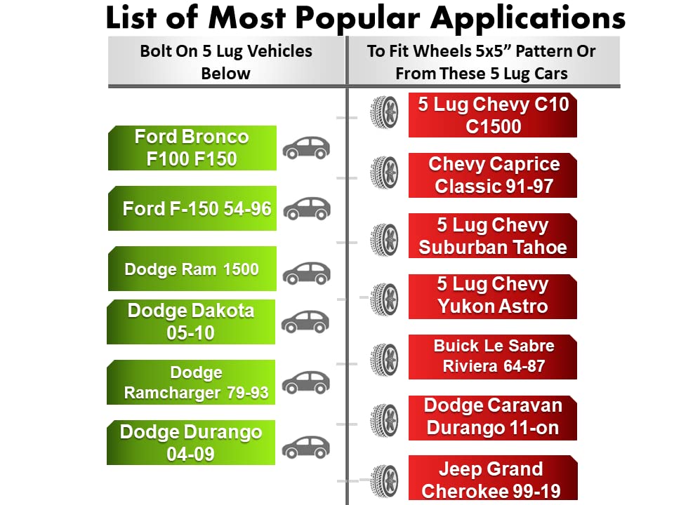 Product Information: The wheel adapter set is used to convert 5 lug 5.5-inch (139.7mm) hub bolt pattern to fit 5 lug 5-inch (127mm) bolt pattern wheels. They will also space out your wheels for 1.5-inch to help you get enough clearance for wider tires and rims. CNC machined with precision craftsmanship using 6061 T6 aerospace quality billet, featured in high load capacity and corrosion resistance. High quality studs are pre-installed and 1/2''-20 thread size mounting open end lug nuts are included. Sold as a pair for 2 wheels. Order 2 pairs for all 4 wheels. Fit on Following Vehicles: Fits Dodge Ramcharger 1979-1983 Fits Dodge Ram 1/2 Ton 2&4 WD 1994-2001 Fits Dodge Ram 1/2 & 3/4 Ton Truck 1979-1993 Fits Dodge Ram Van 1985-1996 Fits Ford Bronco 1966-on Fits Ford F 1/2 Ton, F-100, F-150 1954-1996 Fits Ford 1/2 Ton E-100, 150 Van 1970-1996 Adapter Specification: Vehicle Bolt Pattern: 5x5.5'' (5x139.7mm) Wheel Bolt Pattern: 5x5'' (5x127mm) Studs Thread Size: 1/2''-20 Hub Bore Size: 87mm Thickness: 1.5-inch (38mm) Torque: 85 ft-lbs Technical Notes: If hub studs protrude outside adapter and prevent wheels from sitting flush, it is required to shorten the factory studs.
