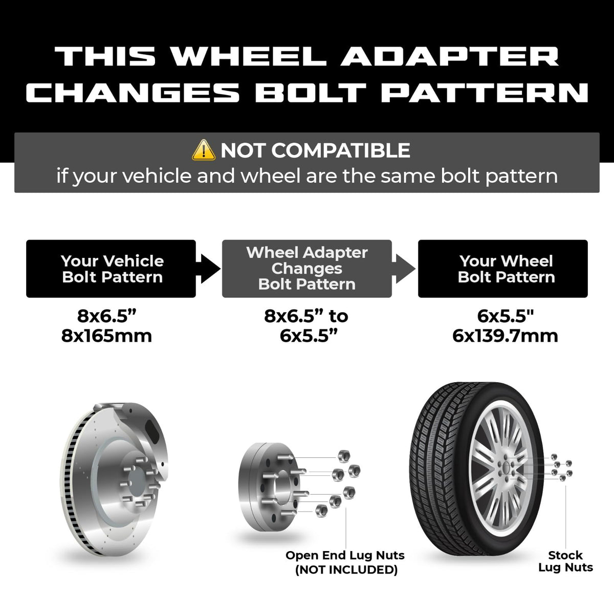 Q: Will these adapters fit my vehicle?A: These adapters are designed for vehicles with an 8x6.5" or 8x165mm bolt pattern. You should confirm your vehicle's specifications to ensure compatibility with the 6x5.5" or 6x139.7mm wheels before purchasing.