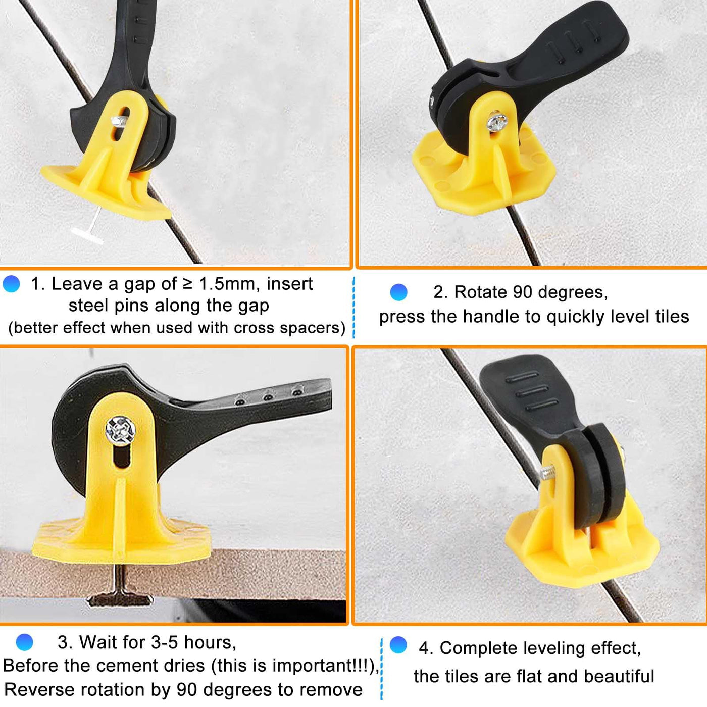 (New Upgrade & Simple Easy To Use): No additional assembly tools needed! Just insert the 1/16'(1.5mm) steel T-pin along the gap of the tile, after rotating 90 degrees, press the black handle fix and lock the tiles, keep the tile same level, wait 3-5 hours, take out the tile leveler before the cement is dry. (Tip note: take out its before the cement is dry!)