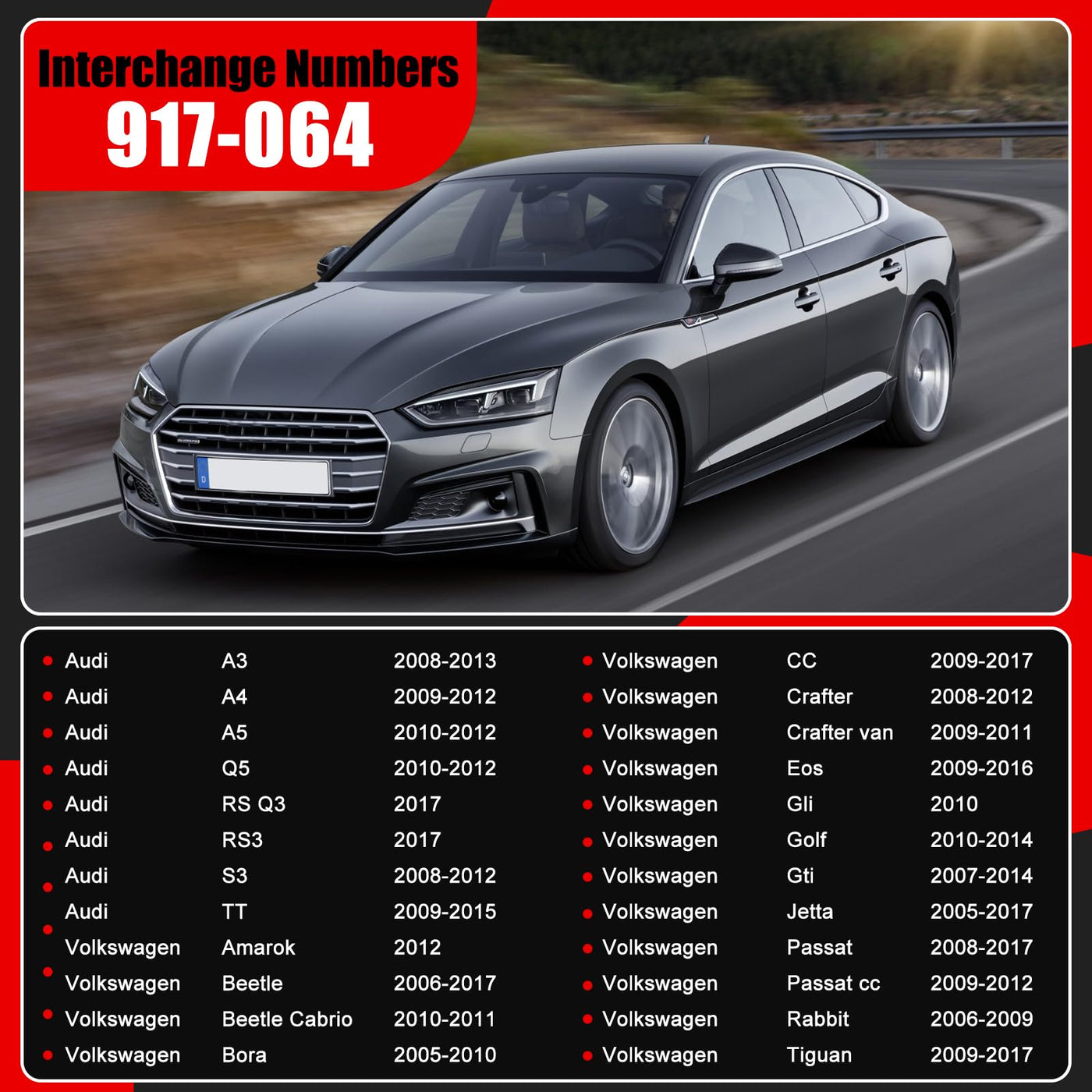 Compatibility: 917-064, 06H103495AC, 06H103495AH, 06H103495AK, 06H103495E, 07K103469F, 07K103469G, 07K103469L, 07K103469M Vechicles Compatibility: For AUDI A3 2008-2013 For AUDI A4 2009-2012 For AUDI A5 2010-2012 For AUDI Q5 2010-2012 For AUDI RS Q3 2017 For AUDI RS3 2017 For AUDI S3 2008-2012 For AUDI TT 2009-2015 For VOLKSWAGEN AMAROK 2012 For VOLKSWAGEN BEETLE 2006-2017 For VOLKSWAGEN BEETLE CABRIO 2010-2011 For VOLKSWAGEN BORA 2005-2010 For VOLKSWAGEN CC 2009-2017 For VOLKSWAGEN CRAFTER 2008-2012 For VOLKSWAGEN CRAFTER VAN 2009-2011 For VOLKSWAGEN EOS 2009-2016 For VOLKSWAGEN GLI 2010 For VOLKSWAGEN GOLF 2010-2014 For VOLKSWAGEN GTI 2007-2014 For VOLKSWAGEN JETTA 2005-2017 For VOLKSWAGEN PASSAT 2008-2017 For VOLKSWAGEN PASSAT CC 2009-2012 For VOLKSWAGEN RABBIT 2006-2009 For VOLKSWAGEN TIGUAN 2009-2017