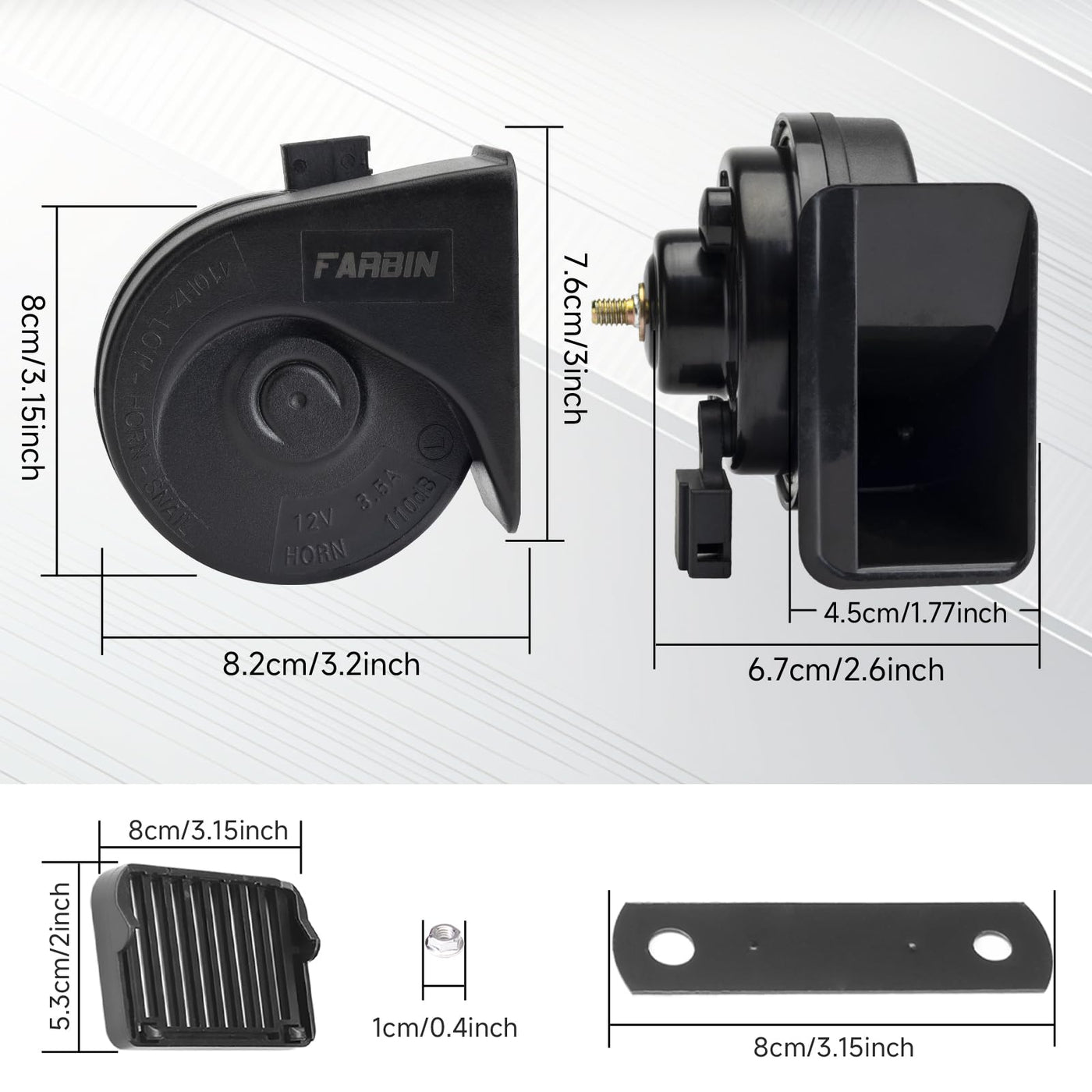 The horns are suitable for Toyota, Lexus, Subaru, red flag and other models series etc. Name: FARBIN Special Horn Color: Black Sound Level: 130DB Voltage: 12V Current: 7A Package Weight: 720g Material: Copper Wire Coil + ABS Shell Include: High Note Horn+Low Note Horn+2 Nuts + 4 Support Plates If you have any installation and wiring problems, you can contact us at any time, and we will serve you until you are satisfied! Thank you very much for your support of FARBIN products!