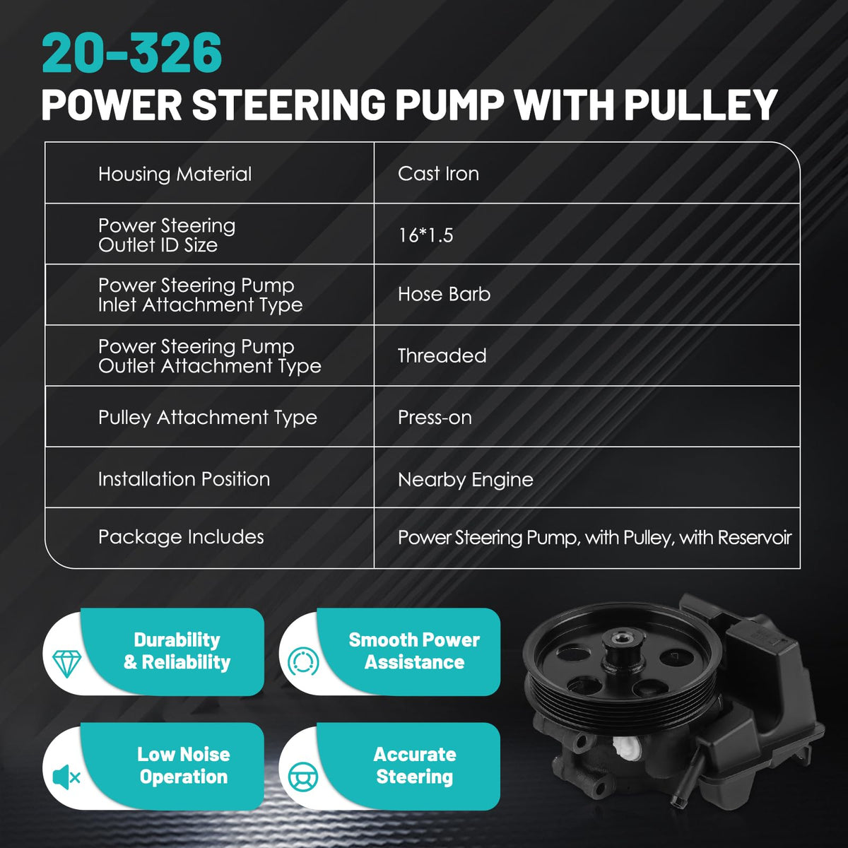 Upgrade Your Vehicle's Steering Performance with the 20-326 Power Steering PumpPart Number:20-326, 20326, 7120153, N7120153, 2074326, 6S4Z-3A674-A, 6S4Z-3A674-ARM,7S4Z-3A674-A, 6S4Z3A674A, 6S4Z3A674ARM, 7S4Z3A674APower Steering Pump Feature:Effectively reduce resistance to the steering wheel, making the driver easier.Made of alloy and plastic, test before delivery.Sophisticated design can match your power steering pump.Find the failed part, directly replace the new power steering pump.Compatibility:for Ford Focus 2006-2011 L4 2.0L Gasfor Ford Focus 2006-2007 L4 2.3L Gasfor Ford Focus 2007 l5 2.5L Gasfor Ford Transit Connect 2010-2011 L4 2.0L GasNote: This list is a sample of all the compatible cars for this part. Make sure this product fits your car by using the part finder above.Why choose Farrme Power Steering Pump with Pulley:1. Superior Quality: Farrme power steering pump is built with exceptional quality and durability, ensuring long-lasting performance and reliability.2. Efficient Steering Performance: Farrme pump generates the necessary hydraulic pressure to provide efficient and responsive steering assistance, making your driving experience smooth and precise.3. Enhanced Reliability: We prioritize reliability in our product design, minimizing the risk of sudden failures or leaks, allowing you to drive with confidence and peace of mind.4. OEM Part Number: This 6S4Z3A674A power steering pump is designed and manufactured with OEM standards.5. Direct Replacement: This steering system pump is a direct replacement product. If your original power steering pump is failing or leaking, this replacement steering pump could be your best choice.6. Function: The power steering pump with pulley is designed to provide hydraulic assistance to the steering system, making it easier for drivers to turn their vehicle's wheels.7. Improved Steering Control: The power steering pump enhances steering control by supplying pressurized fluid to the steering gear, reducing the effort required to maneuver the vehicle.IMPORTANT NOTICE BEFORE INSTALLATION:?Please verify your vehicle make, model, year, engine, and OEM part number before installation. Contact-us if you're unsure about compatibility.? Flush the entire power steering system thoroughly before installing the new pump. Contaminated fluid can lead to premature failure.? Always replace old O-rings and seals on both high-pressure and return hoses. Reusing worn seals can cause external leaks.? Use only the manufacturer-recommended power steering fluid. Mixing fluid types can damage the system.? Do not overtighten mounting bolts. Excessive torque can crack the pump housing.? Bleed air from the system by turning the steering wheel fully left and right several times before starting the engine, then repeat after startup.? Professional installation is strongly recommended. Improper installation may lead to noise, leaks, or loss of power assist.Signs of a faulty power steering pump(aka: power assit pump or vane pump) include:? steering fluid leaks? squealing noise when steering? heavy and jerky steering? metal flakes in the fluid? power steering symbol on dashboardPrecautions for installation:About Noisy:Check whether the resistance of the suction pipe is too high.Check whether the pressure adjustment of the safety valve is too high.The gas in the pump must be evacuated, check the tightness of each joint, prevent air from entering.About Leaking:Check whether the pipes and pipe joints are damaged.Tighten the fixing screws of the booster pump.Check, clean or replace the filter device, keep the oil circuit unblocked, and avoid the valve core being blocked by foreign matter.How to install the power steering pump:1. Ensure the vehicle is stationary and disconnect the negative terminal of the battery.2. Locate the original power steering pump, typically located near the front of the engine, close to the crankshaft and steering system.3. Using the appropriate tools, loosen and remove the belt from the original power steering pump, making a note of the belt's routing for future installation.4. Unbolt or remove the fastening screws of the original power steering pump and take it off the vehicle.5. Align the new power steering pump with the corresponding bracket or base on the vehicle and secure it in place using bolts or fastening screws.6. Install the belt correctly on the new power steering pump, following the routing recorded from the original pump.7. Ensure the belt is properly tensioned.8. Check the tightness of all installed bolts or fastening screws to ensure the pump is securely mounted.9. Reconnect the negative terminal of the vehicle's battery.10. Start the vehicle and check if the power steering pump operates smoothly without any abnormal noises or fluid leaks.
