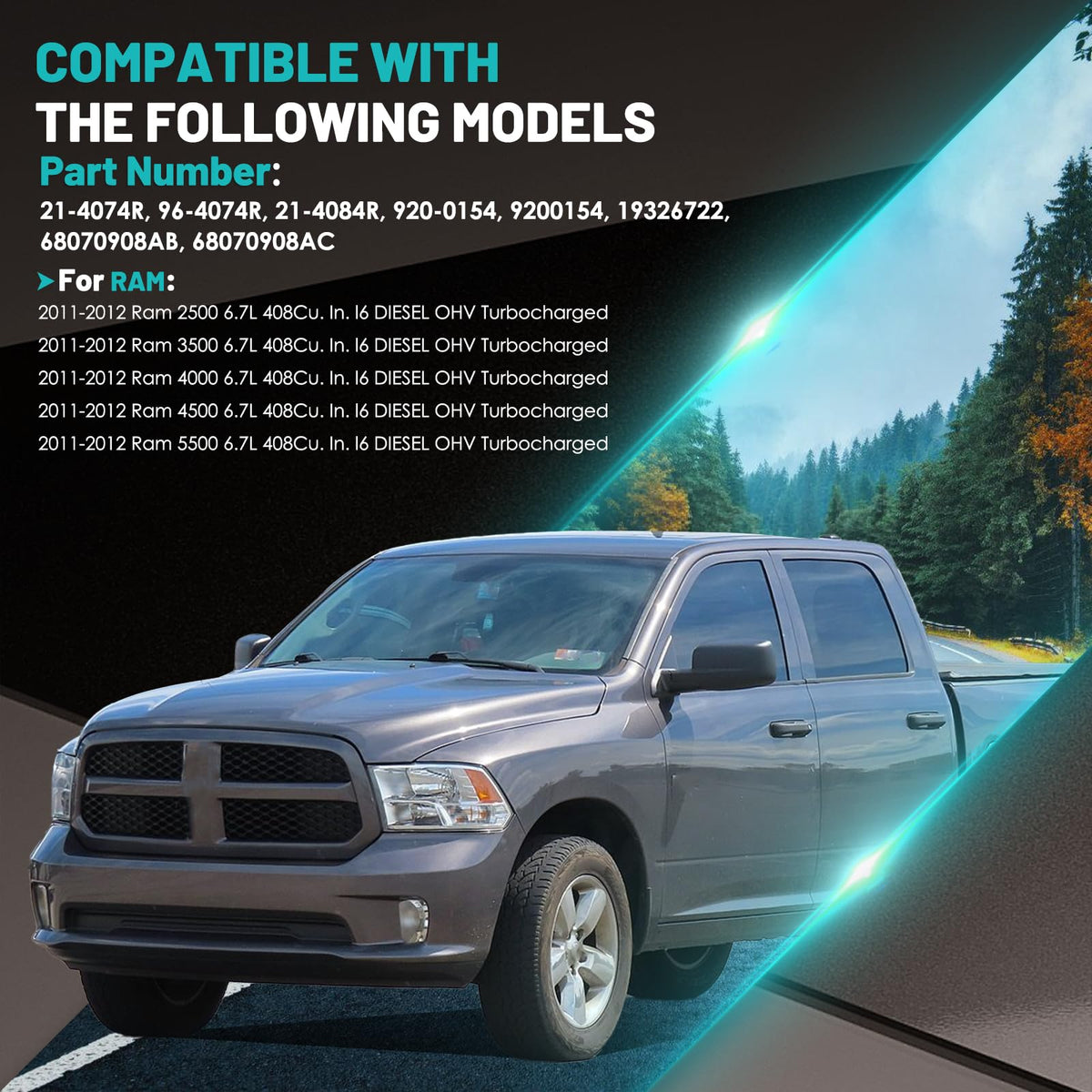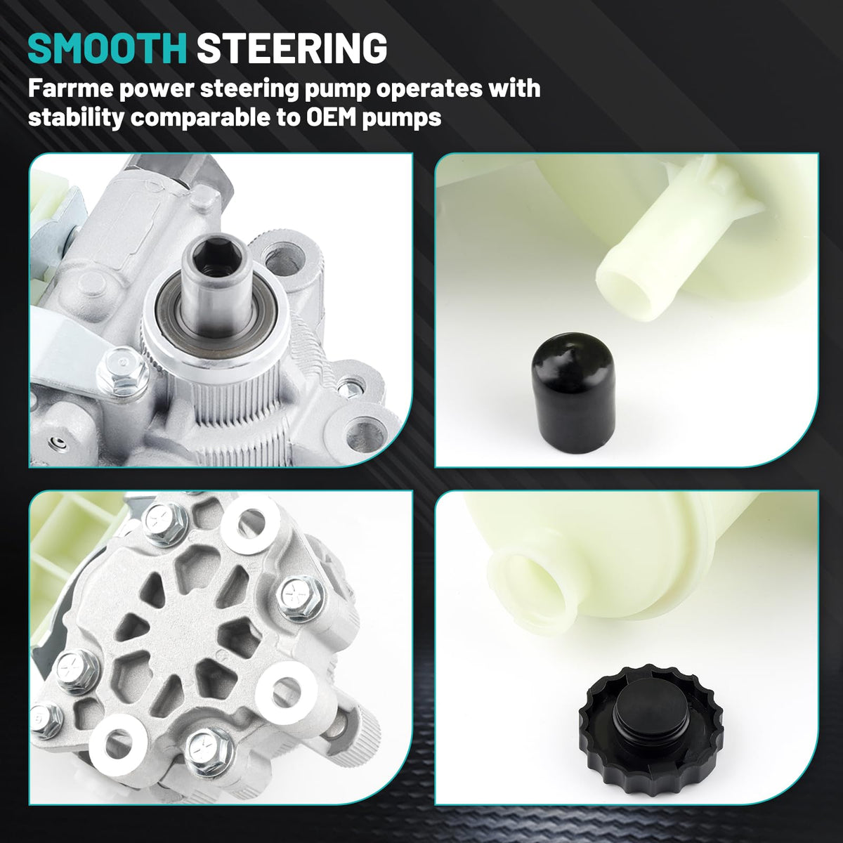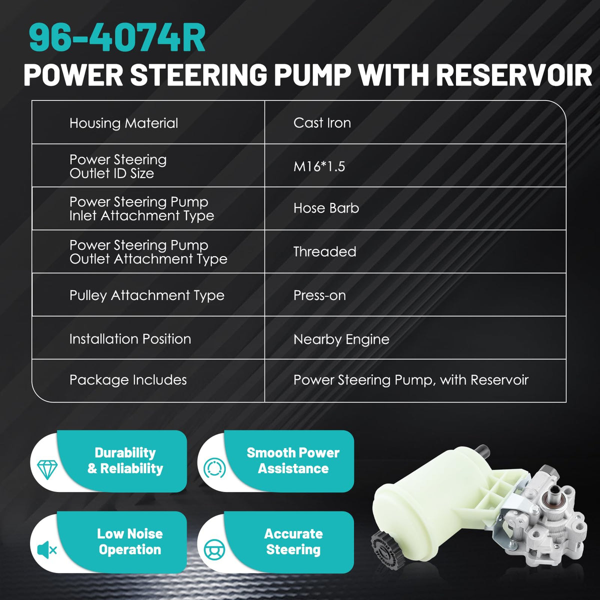 Upgrade Your Vehicle's Steering Performance with the 21-4074R Power Steering PumpPart Number:21-4074R, 96-4074R, 21-4084R, 920-0154, 9200154, 19326722, 68070908AB,68070908AC, 68070907AB, 68070907AC, 68070908AC, 68225509AA, 68225509ABPower Steering Pump Feature:Effectively reduce resistance to the steering wheel, making the driver easier.Made of alloy and plastic, test before delivery.Sophisticated design can match your power steering pump.Find the failed part, directly replace the new power steering pump.Compatibility:for Ram 2500 2011-2012 L6 6.7Lfor Ram 3500 2011-2012 L6 6.7Lfor Ram 4500 2011-2012 L6 6.7Lfor Ram 5500 2011-2012 L6 6.7LNote: This list is a sample of all the compatible cars for this part. Make sure this product fits your car by using the part finder above.Why choose Farrme Power Steering Pump with Pulley:1. Superior Quality: Farrme power steering pump is built with exceptional quality and durability, ensuring long-lasting performance and reliability.2. Efficient Steering Performance: Farrme pump generates the necessary hydraulic pressure to provide efficient and responsive steering assistance, making your driving experience smooth and precise.3. Enhanced Reliability: We prioritize reliability in our product design, minimizing the risk of sudden failures or leaks, allowing you to drive with confidence and peace of mind.4. OEM Part Number: This 96-4074R power steering pump is designed and manufactured with OEM standards.5. Direct Replacement: This steering system pump is a direct replacement product. If your original power steering pump is failing or leaking, this replacement steering pump could be your best choice.6. Function: The power steering pump with reservoir is designed to provide hydraulic assistance to the steering system, making it easier for drivers to maneuver their vehicles.7. Enhanced Steering Control: By supplying pressurized fluid to the steering gear, the power steering pump enhances steering response, reducing the effort required to steer the vehicle.IMPORTANT NOTICE BEFORE INSTALLATION:?Please verify your vehicle make, model, year, engine, and OEM part number before installation. Contact-us if you're unsure about compatibility.? Flush the entire power steering system thoroughly before installing the new pump. Contaminated fluid can lead to premature failure.? Always replace old O-rings and seals on both high-pressure and return hoses. Reusing worn seals can cause external leaks.? Use only the manufacturer-recommended power steering fluid. Mixing fluid types can damage the system.? Do not overtighten mounting bolts. Excessive torque can crack the pump housing.? Bleed air from the system by turning the steering wheel fully left and right several times before starting the engine, then repeat after startup.? Professional installation is strongly recommended. Improper installation may lead to noise, leaks, or loss of power assist.Signs of a faulty power steering pump(aka: power assit pump or vane pump) include:? steering fluid leaks? squealing noise when steering? heavy and jerky steering? metal flakes in the fluid? power steering symbol on dashboardPrecautions for installation:About Noisy:Check whether the resistance of the suction pipe is too high.Check whether the pressure adjustment of the safety valve is too high.The gas in the pump must be evacuated, check the tightness of each joint, prevent air from entering.About Leaking:Check whether the pipes and pipe joints are damaged.Tighten the fixing screws of the booster pump.Check, clean or replace the filter device, keep the oil circuit unblocked, and avoid the valve core being blocked by foreign matter.How to install the power steering pump:1. Ensure the vehicle is stationary and disconnect the negative terminal of the battery.2. Locate the original power steering pump, typically located near the front of the engine, close to the crankshaft and steering system.3. Using the appropriate tools, loosen and remove the belt from the original power steering pump, making a note of the belt's routing for future installation.4. Unbolt or remove the fastening screws of the original power steering pump and take it off the vehicle.5. Align the new power steering pump with the corresponding bracket or base on the vehicle and secure it in place using bolts or fastening screws.6. Install the belt correctly on the new power steering pump, following the routing recorded from the original pump.7. Ensure the belt is properly tensioned.8. Check the tightness of all installed bolts or fastening screws to ensure the pump is securely mounted.9. Reconnect the negative terminal of the vehicle's battery.10. Start the vehicle and check if the power steering pump operates smoothly without any abnormal noises or fluid leaks.