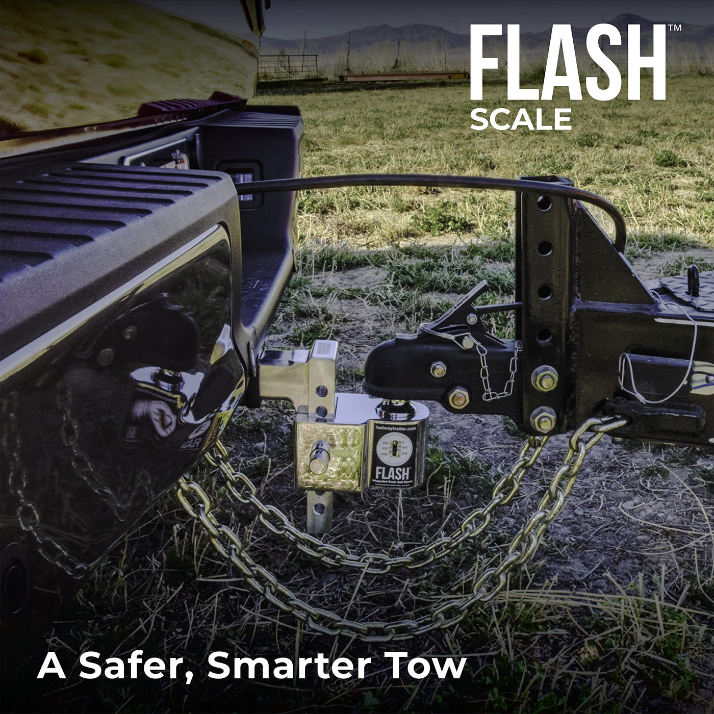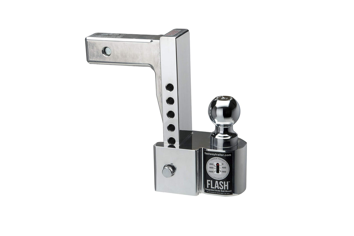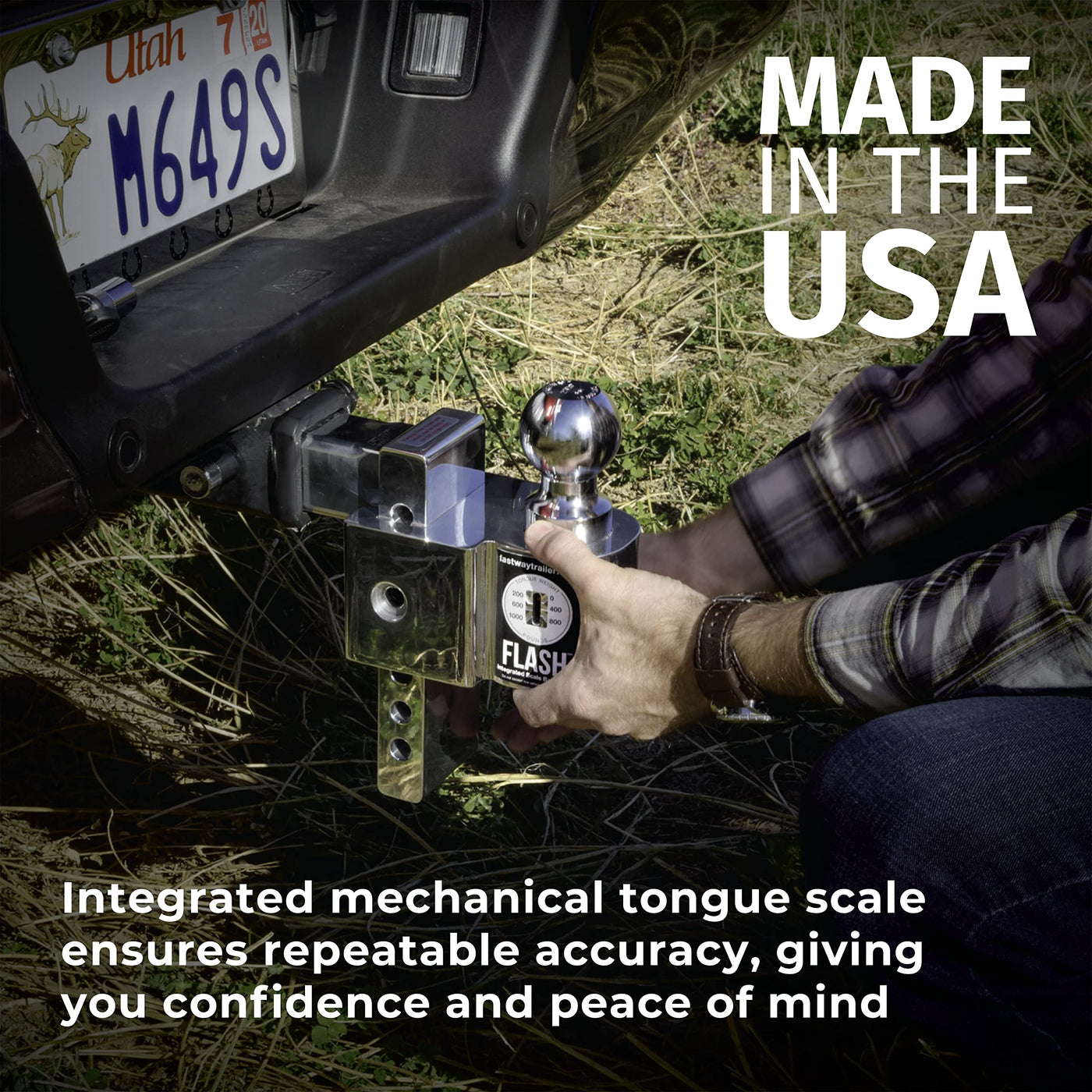 The FLASH SCALE Ball Mount features a mechanical tongue scale built into the ball mount that measures the tongue weight of your trailer load, providing safer, more confident towing. | When loading a trailer, the tongue weight should be 10-15% of the total trailer weight. The FLASH ISBM makes it easy to know if your trailer is loaded properly by showing how much of the trailer weight is on the tongue. | Made to fit your 2 receiver, includes both 2” & 2-5/16” chrome hitch balls and has a 1,000 lb tongue / 10,000 lb max trailer weight. | The FLASH SCALE easily handles the heaviest of loads, at about half the weight of comparable steel ball mounts. This makes carrying, adjusting, and installing your FLASH ISBM easy and comfortable. | Made from aircraft-grade aluminum, providing corrosion resistance and unmatched strength and durability.
