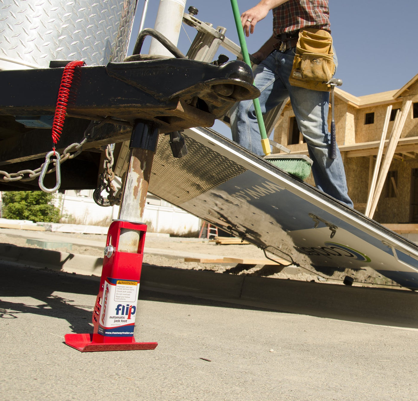 Q: How does the flip feature of the Fastway jack foot work?A: The flip feature allows the foot plate to flip up automatically as the jack is retracted, simplifying storage and eliminating the need for additional blocks of wood.