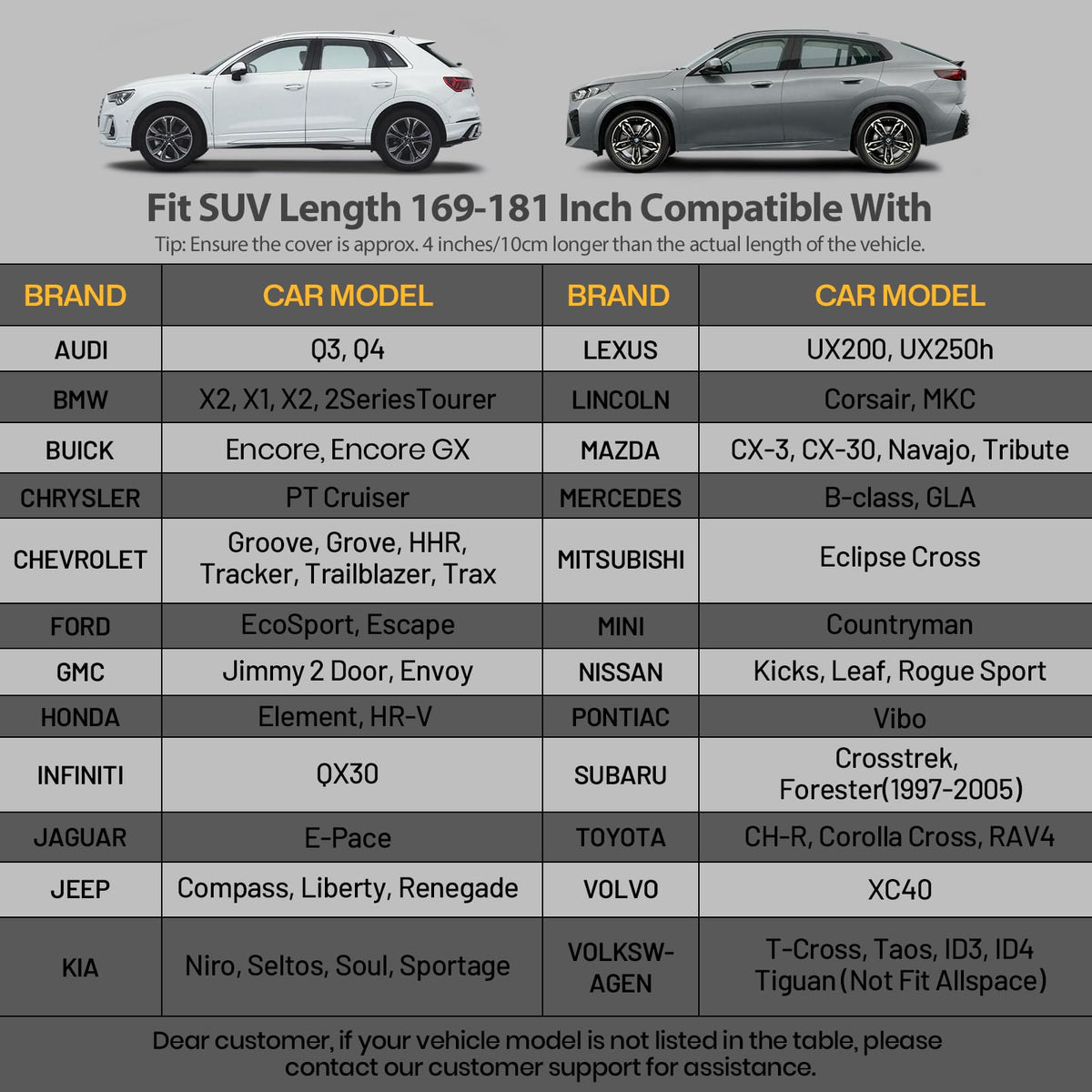 Favoto 6-layers suv car cover all weather for automobiles car trap waterproof outdoor sun snow protection Details:Material: PEVA+CottonDimension: 183 '' x 73 '' x 63 '' / 4.65m x 1.85m x 1.6mWeight: 6.72 lb / 3.05kgSuitable for: 170 to 183 inch / 4.35 to 4.65 meters in length suv carsColor: BlackFeature: with driver door zipper, 2 windproof straps, reflective stripes, 4 wheel tie-down Straps, elastic band Package includes:1 x Favoto car cover1 x Windproof strap1 x Storage bag