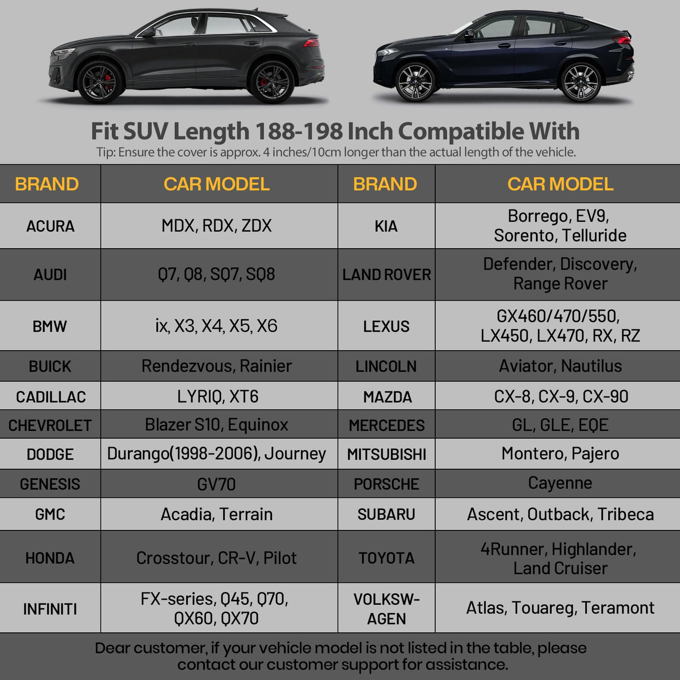 Favoto 6-layers suv car cover all weather for automobiles car trap waterproof outdoor sun snow protection Details:Material: PEVA+CottonDimension: 198'' x 77'' x 69'' / 5.05m x 1.95m x 1.75mWeight: 7.7 lb / 3.5kgSuitable for: 188 to 198 inch / 4.75 to 5.05 meters in length suv carsColor: BlackFeature: with driver door zipper, 2 windproof straps, reflective stripes, 4 wheel tie-down Straps, elastic band Package includes:1 x Favoto car cover1 x Storage bag