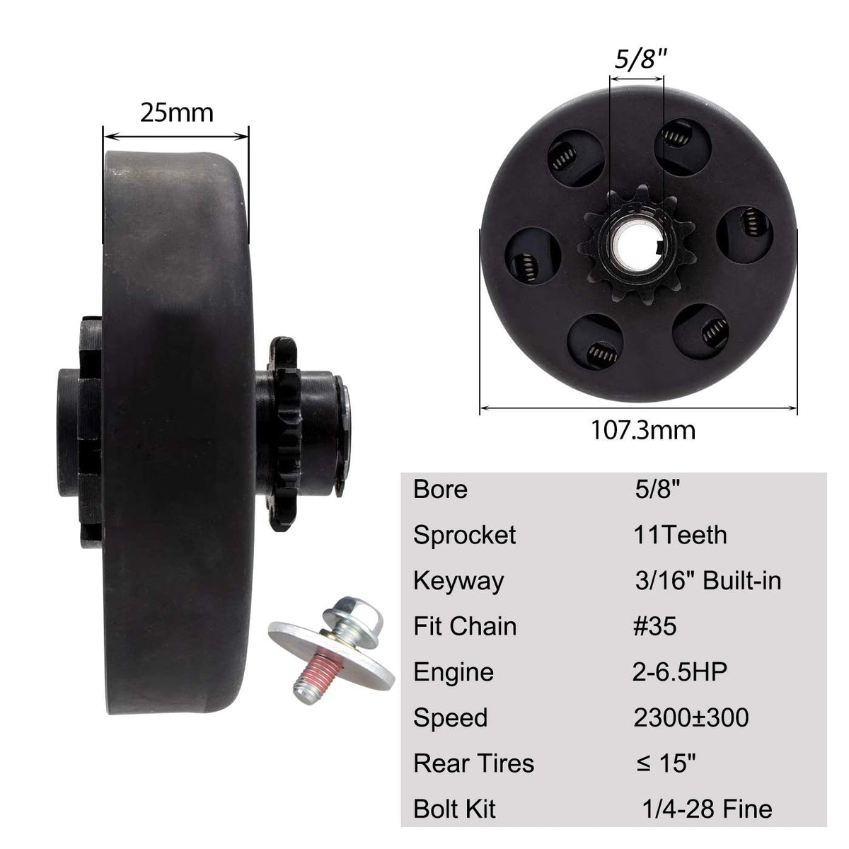 Centrifugal Clutch 5/8'' Bore 11T Fits ScooterX Sport Kart, Mini Bike, Mini Chopper, and Mini Motorcycles 2.8HP 97cc Engines | Go Cart Clutch Fit 2 - 6.5 HP 168 188 Gasoline Engines for Mini Bike,Generator, Garden Tractors,Go Karts, Single Wheel Drive Karts with Tires No Larger Than 15'' Tall | Metric Property Class 8.8 Bolt and Washer Kit are Included. Mounts Onto Crankshaft Using Bolt and Washer on the End of the Crankshaft. | OEM Replacement Quality: Made of Quality Iron Material, Which is Lightweight, Portable, Sturdy, Durable, Maximum Torque, Wear-resisting and Fast Heat Dissipation | Bi-directional Operation, Clutch Can Mount Inward or Outward on Crankshaft, Easy to Install