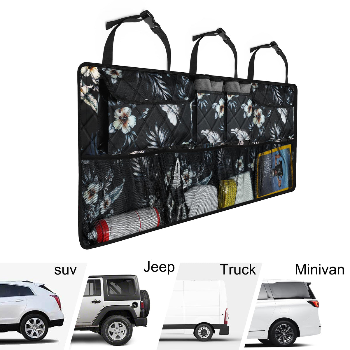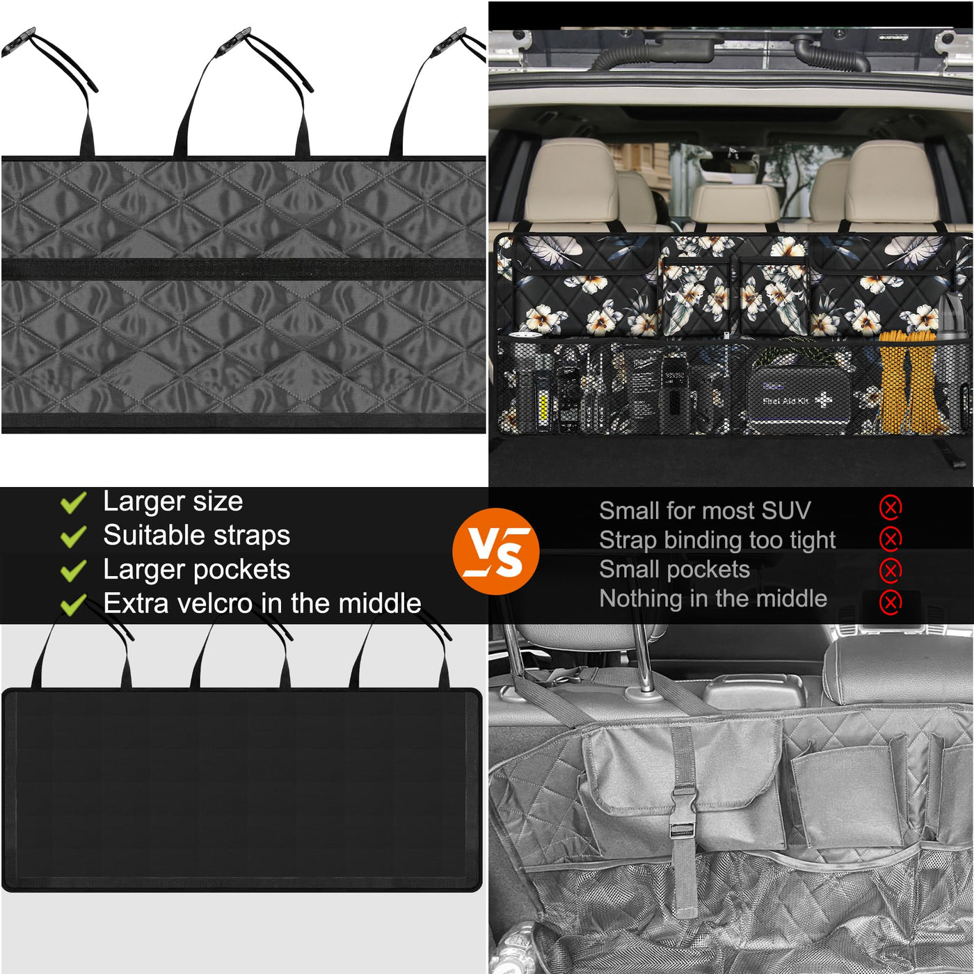 ?Install Easily & Fit 90% Cars?The car trunk organizer holds with 3 strong straps and clip on and off buckles to install easily in seconds. Also fits 90% car types, this trunk organizer for suv,jeep, trunk, minivan,ect. | ?Waterproof & Strengthen Load-bearing?: The collapsible car storage bag is made of composite waterproof material, which is waterproof and splash-proof in the daily application process, and is also easy to clean. Stricter sewing process requirements and durable materials make the product more load-bearing and easy to handle heavy groceries. | ?Upgrade Size?: Improved design for car organizer size to meet more car models and storage needs. The size of the backseat trunk organizer has been changed from about 30 inches to 44 inches, providing more storage space, four cloth pockets and four mesh pockets.Ideal for keeping your car neat and organized. | ?Stability Design?: The car organizer with a firm and stable buckle design, you can adjust the length of the buckle strap according to your needs, so that the product fits more stably and firmly. At the same time, in order to increase the stability of the product, we also added four hook and loop tapes on the back of the product to increase the stability of the product during driving. | ?NOTE? Our suv trunk organizer of reinforcement strip are magic stick, suitable for seat back for felt material, not for leather, glossy, or suede.