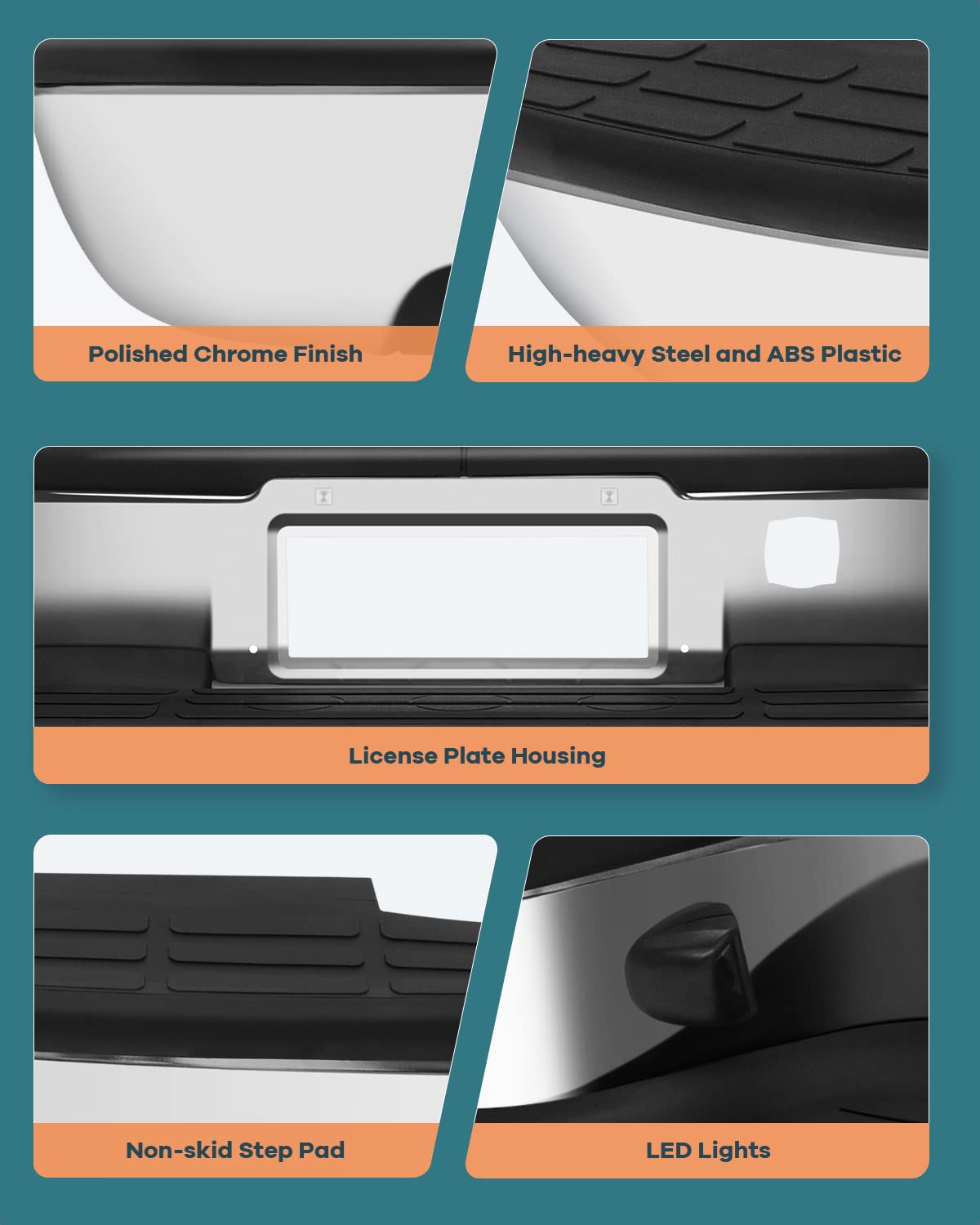 Q: What should I do to maintain the appearance of my chrome rear bumper?A: To maintain the appearance of your chrome rear bumper, regularly clean it with mild soap and water, and avoid abrasive cleaners. A chrome polish can also be used to enhance shine and protect the surface.
