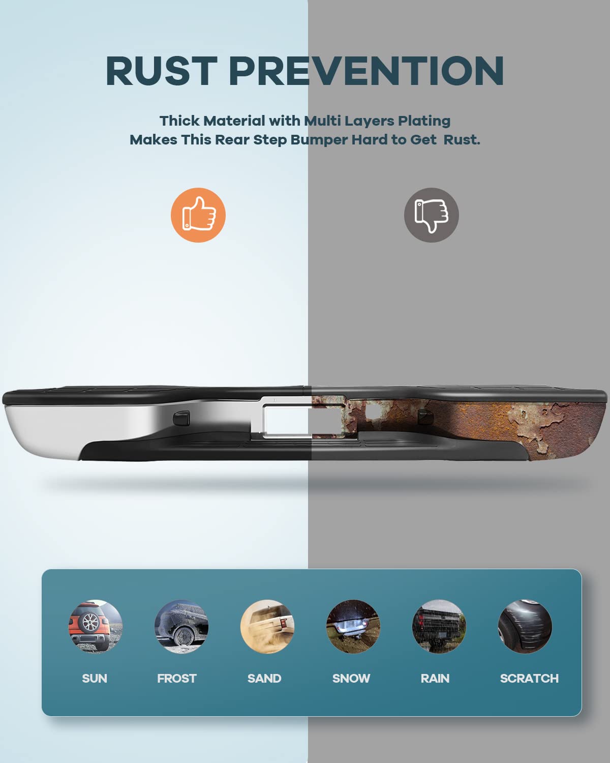 Q: Is the installation of the rear step bumper easy?A: Yes, the rear step bumper features a bolt-on installation design, which means it can be easily mounted without any drilling or modifications required.
