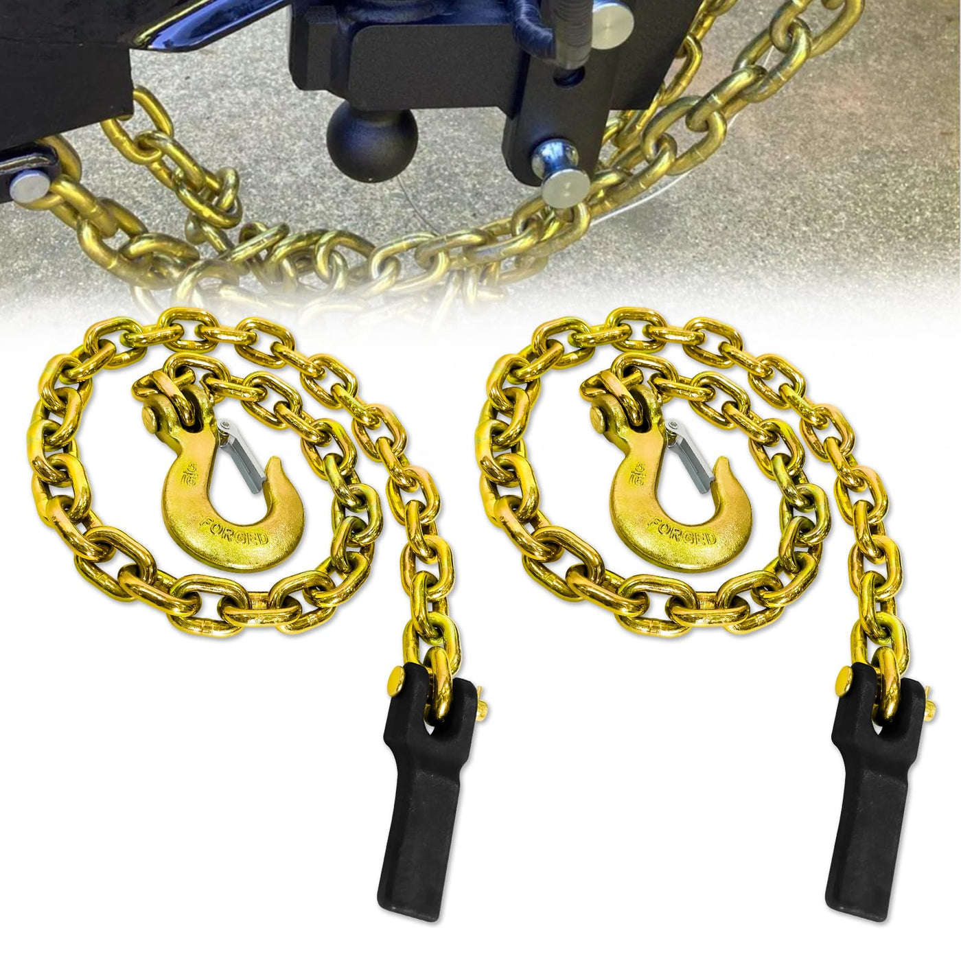Q: What is included in the FITHOIST G80 Trailer Safety Chain package?A: The package includes two 36-inch chains, each equipped with a 5/16'' clevis snap hook and a chain retainer for secure attachment and ease of use.