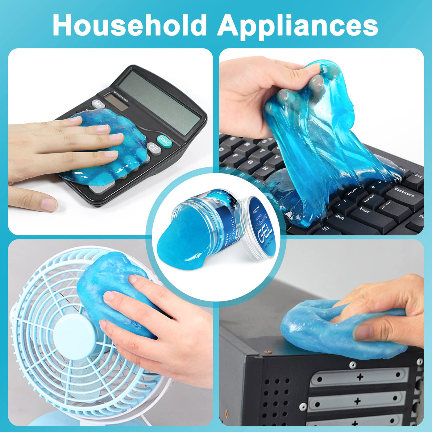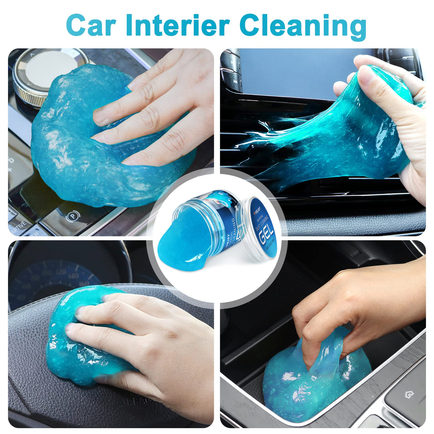 Q: How do I use the FiveJoy Universal Cleaning Gel?A: To use the FiveJoy Universal Cleaning Gel, simply take a small amount of the putty and press it into the area you want to clean, such as your car's air vents or keyboard. Gently pull it away to lift dirt and dust, then store it in its container for reuse.