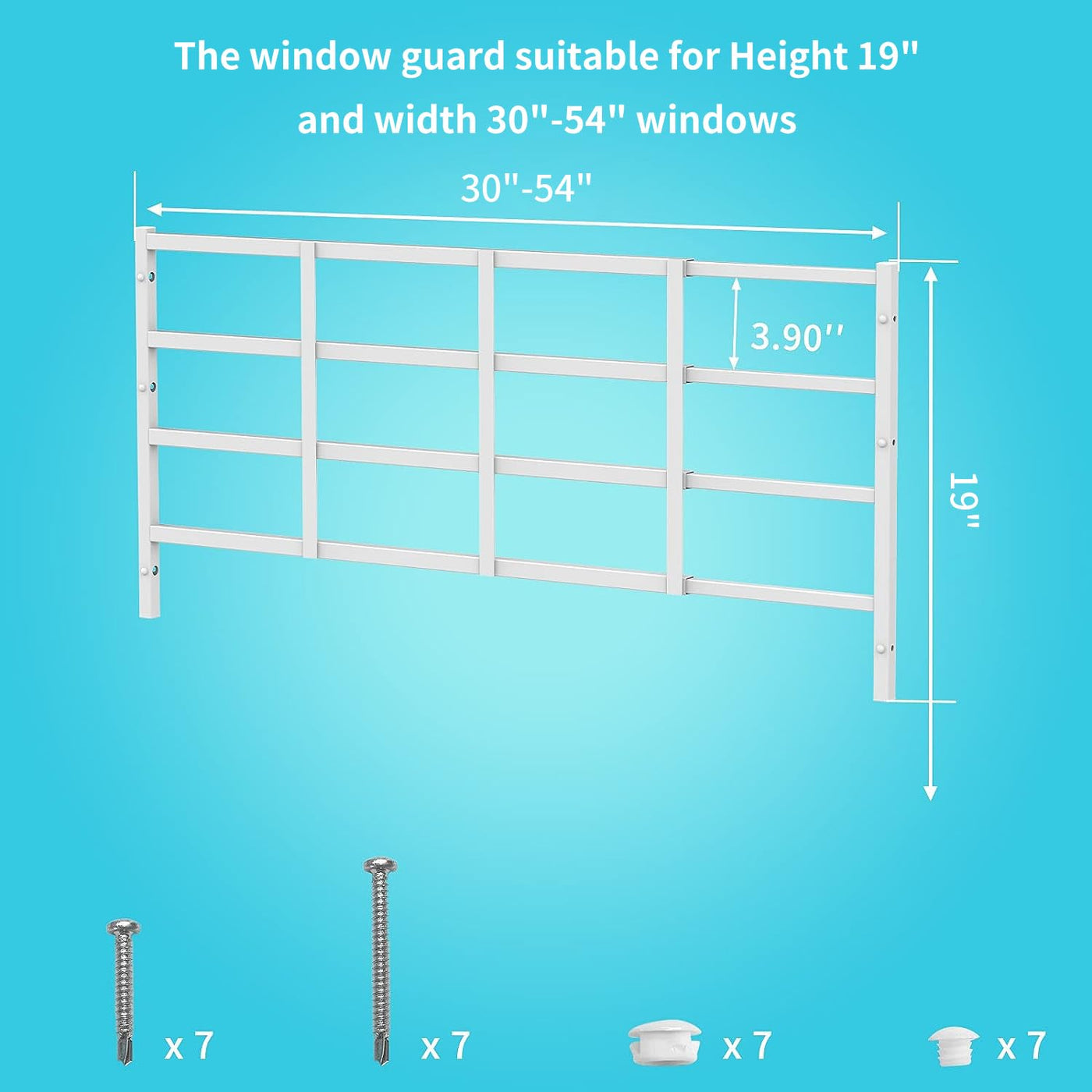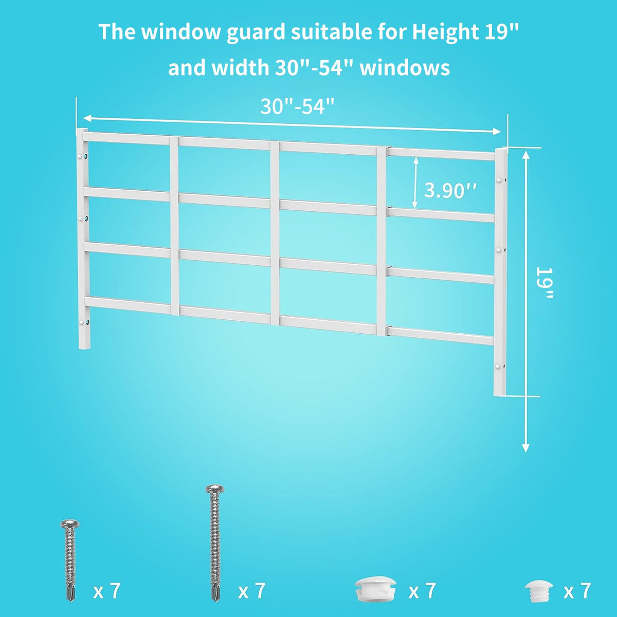Fixed Window Safety Guard For Children Child Kids 19”X 54” Adjustable Width Prevents Accidental Falls, Non-Egress, Tamper Resistant Screws Included, White, Single Pack