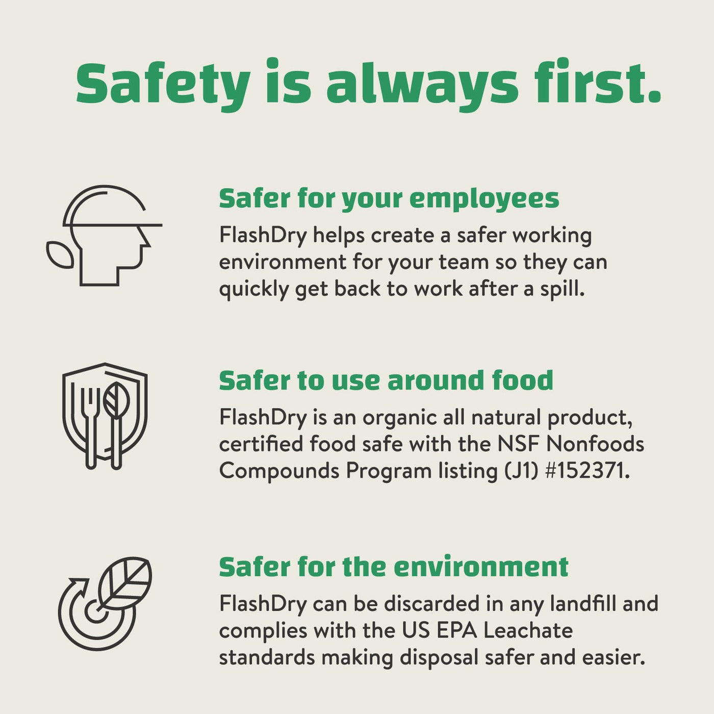 Q: Is FlashDry coir safe to use around food?A: Yes, FlashDry is certified food safe under the NSF Nonfood Compounds Program, making it ideal for use in environments where food is present.
