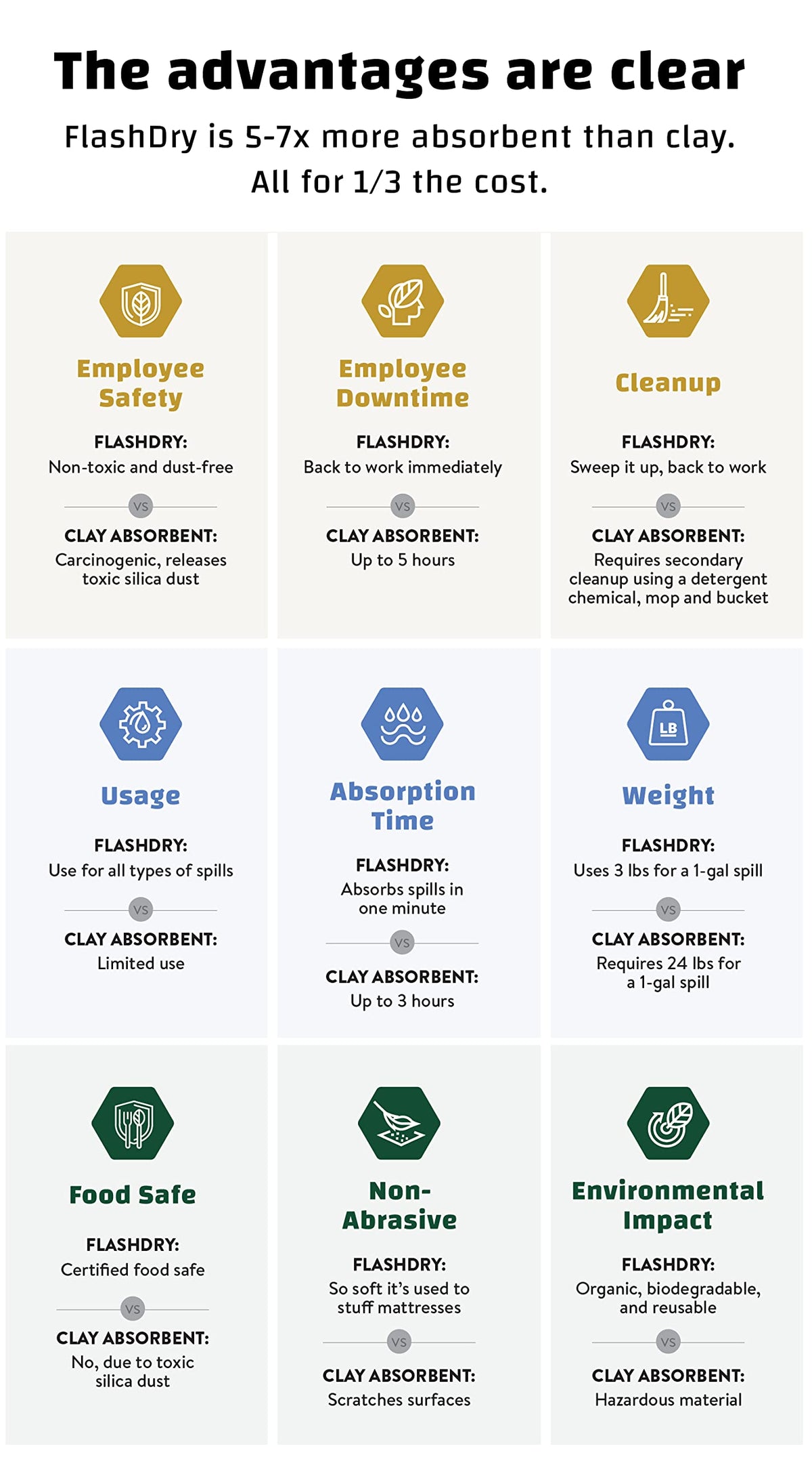 Q: What makes FlashDry coir more effective than clay absorbents?A: FlashDry coir is 5-7 times more absorbent than traditional clay absorbents, allowing for quicker and more effective spill cleanup. Additionally, it is dust-free, non-toxic, and lightweight, making it easier to handle and store.