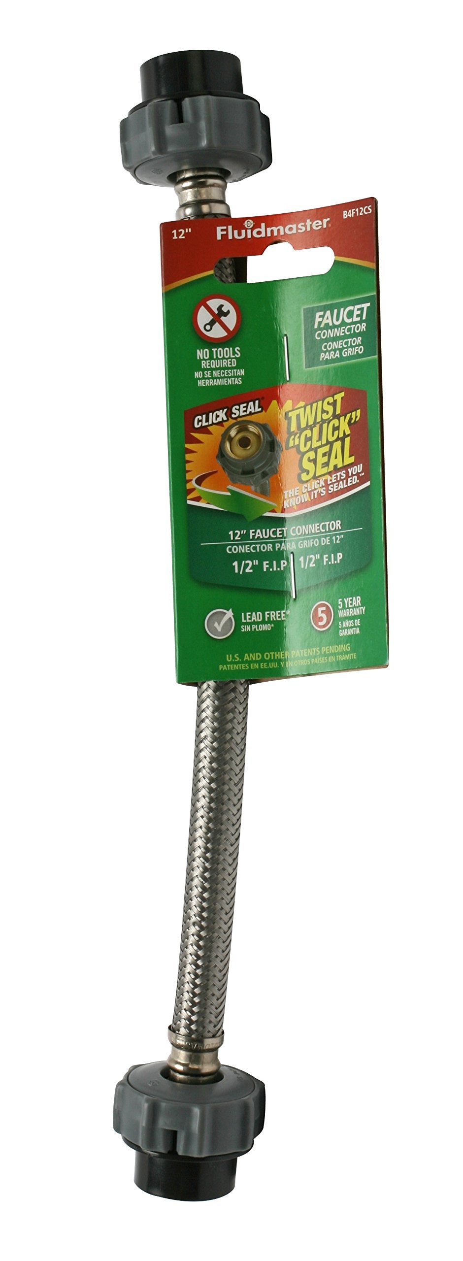 Product Description| Make installs easier with a Fluidmaster Click Seal Faucet Connector | The Click Seal Faucet Connector includes the patented Click Seal nut on both ends of the connector | The nut 'clicks' when a good seal is achieved, so you'll know that the supply line is properly tightened every time | The nut is also extended, so you can comfortably tighten up the connection, even in hard to reach area | The Click Seal connector is also made from braided stainless steel, ensuring maximum durability and flexibilityFrom the ManufacturerTake the guesswork out of faucet installation and repair with a Fluidmaster Click Seal Faucet Connector. The special torque nut 'clicks' when you've tightened to a watertight seal so you know you won't have a leak under the sink. The Click Seal connector is made of stainless steel braiding, protecting your home from catastrophic water damage. 5-year warranty.
