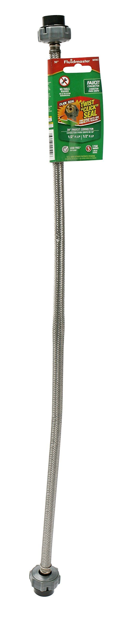 Product Description| Make installs easier with a Fluidmaster Click Seal Faucet Connector | The Click Seal Faucet Connector includes the patented Click Seal nut on both ends of the connector | The nut 'clicks' when a good seal is achieved, so you'll know that the supply line is properly tightened every time | The nut is also extended, so you can comfortably tighten up the connection, even in hard to reach area | The Click Seal connector is also made from braided stainless steel, ensuring maximum durability and flexibilityFrom the ManufacturerTake the guesswork out of faucet installation and repair with a Fluidmaster Click Seal Faucet Connector. The special torque nut 'clicks' when you've tightened to a watertight seal so you know you won't have a leak under the sink. The Click Seal connector is made of stainless steel braiding, protecting your home from catastrophic water damage. 5-year warranty.