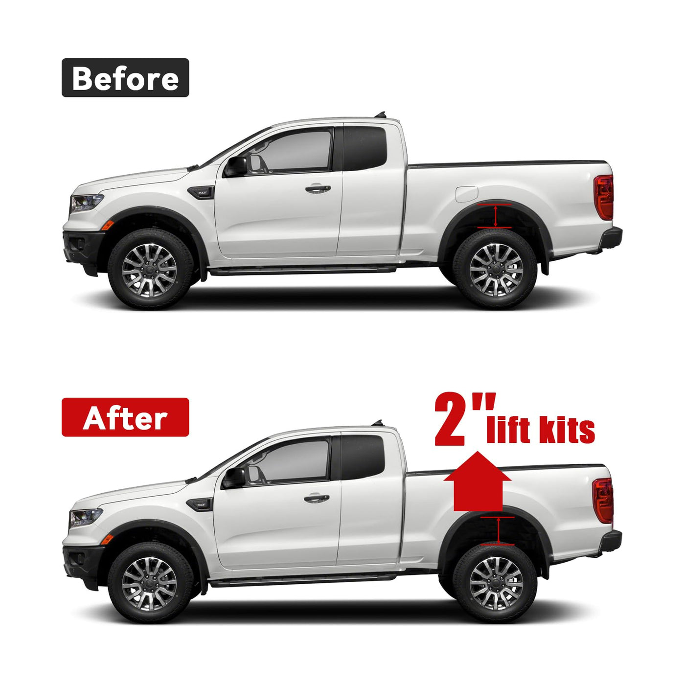 Q: How much lift do the Flycle leveling blocks provide?A: These leveling blocks provide a lift of 2 inches at the rear of your F150, enhancing its stance and overall appearance.