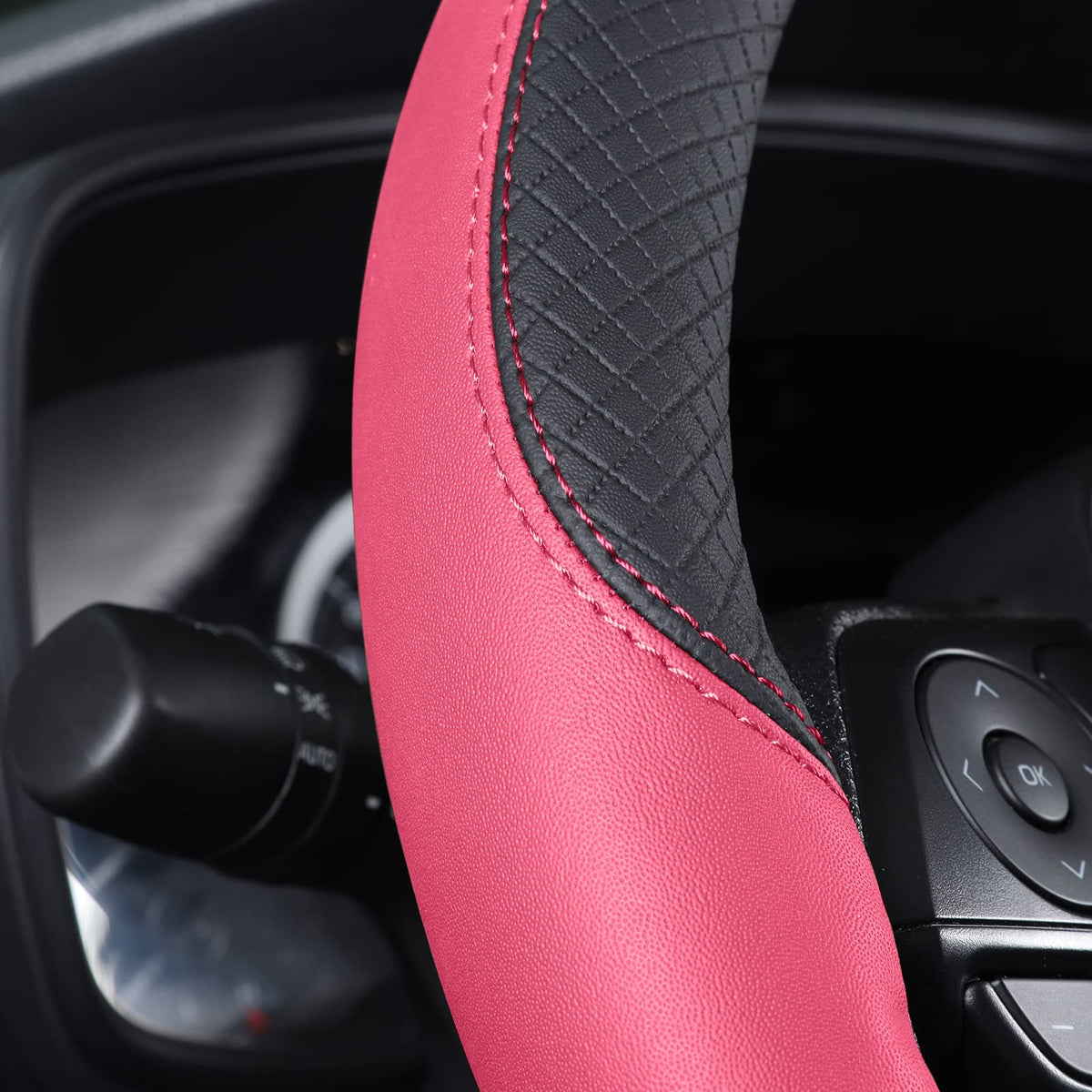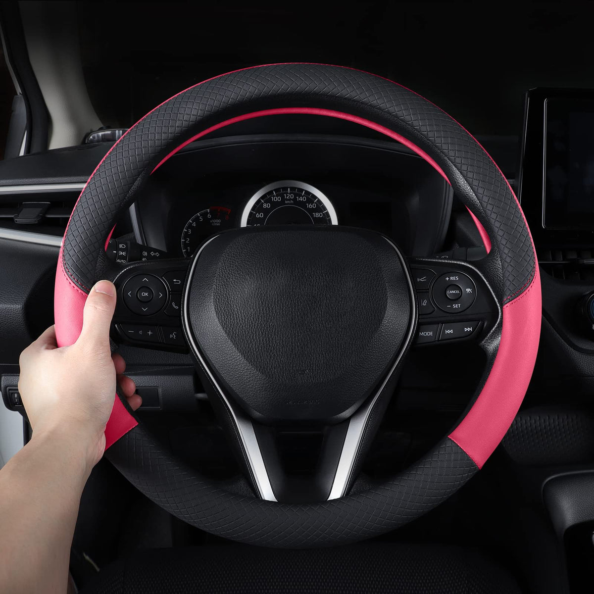 Follicomfy Auto Car Genuine Leather Steering Wheel Cover Anti Slip Wrap 15'' (Hot Pink)