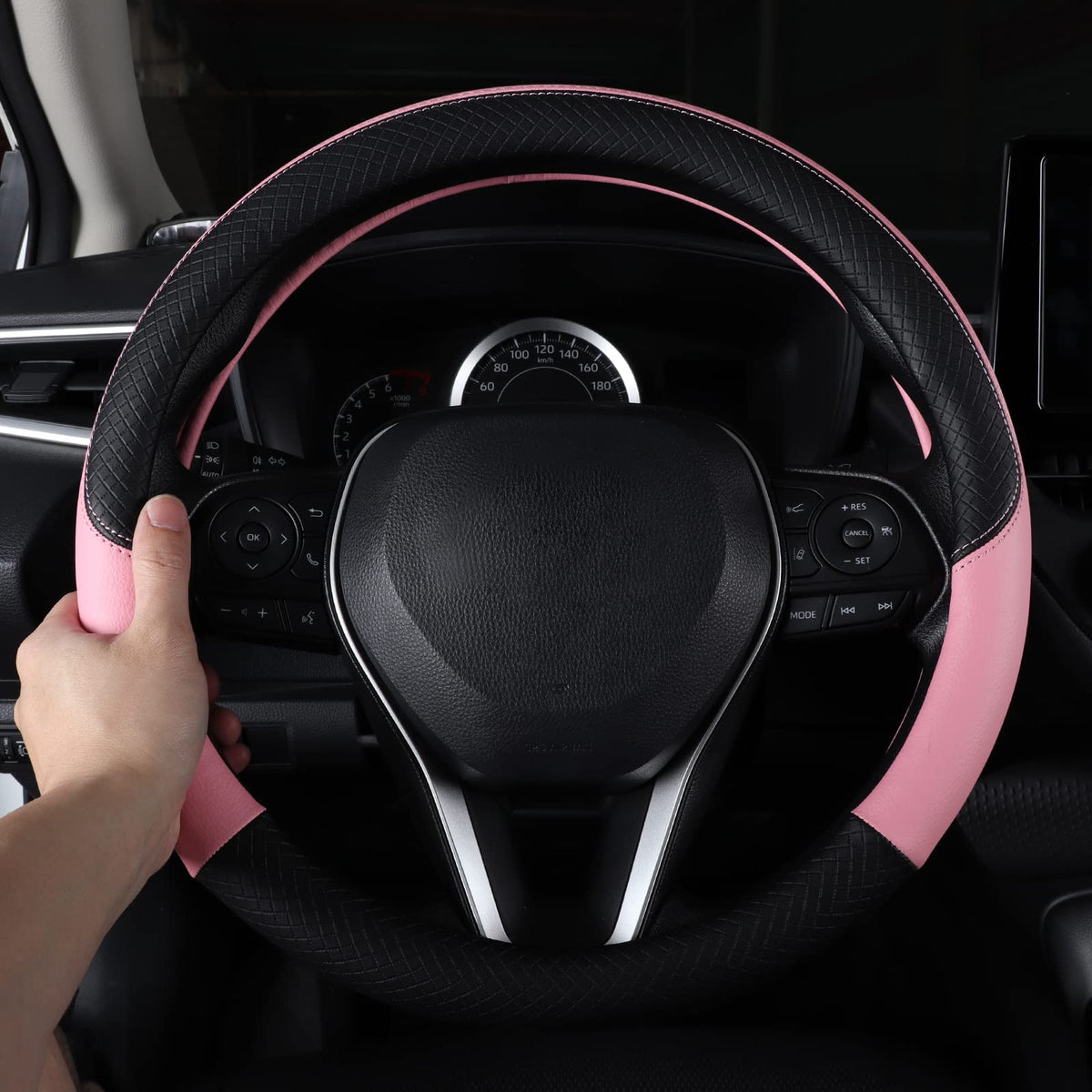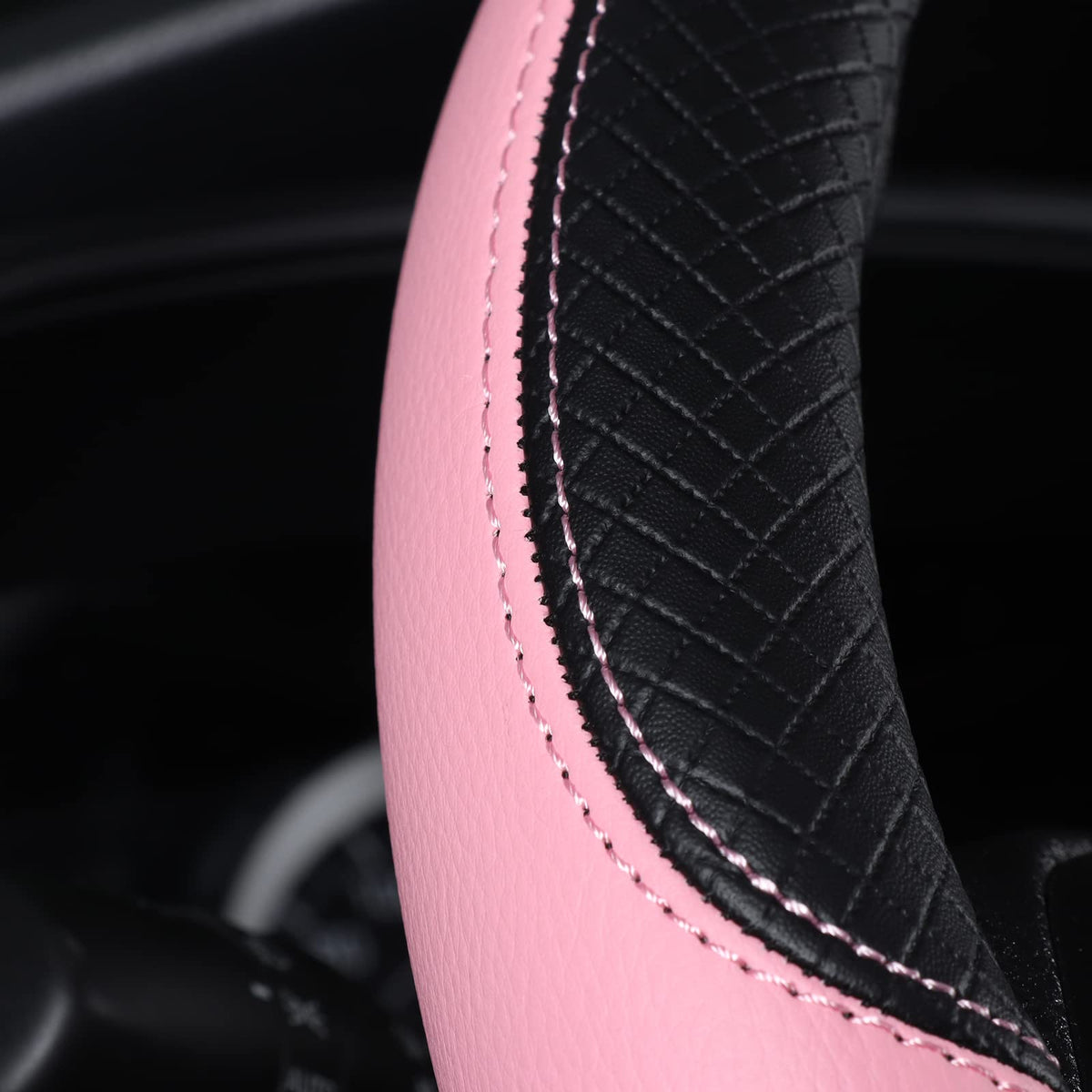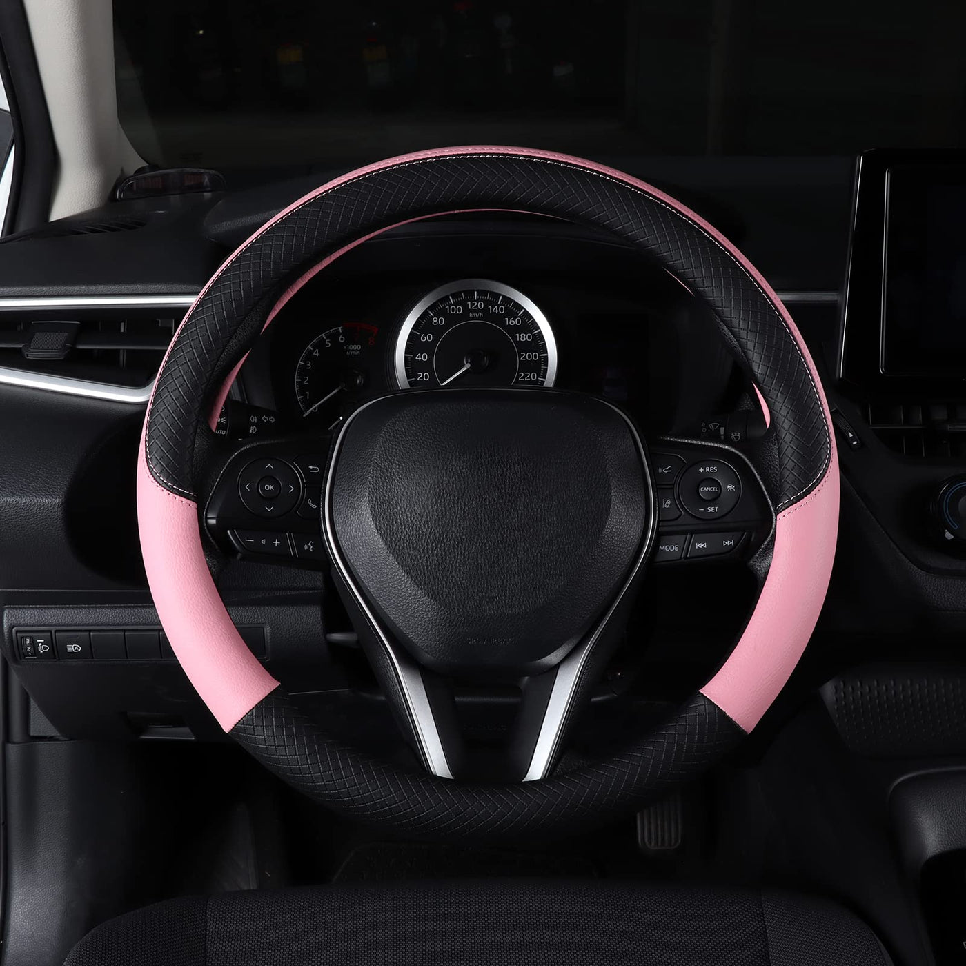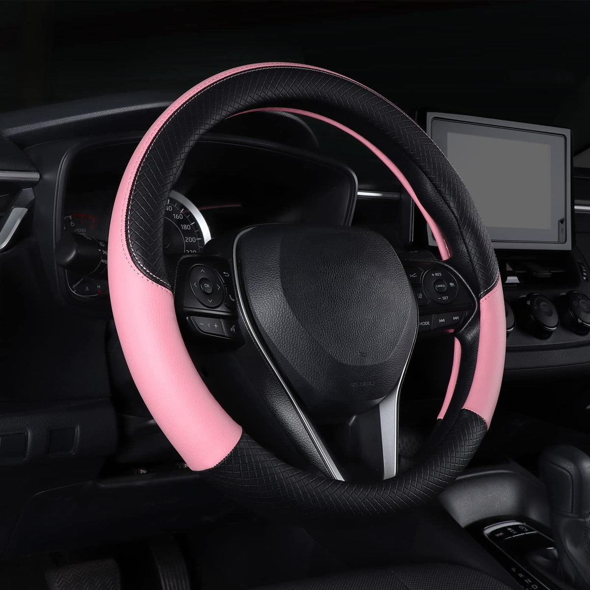 Follicomfy Auto Car Genuine Leather Steering Wheel Cover Anti Slip Wrap 15'' (Pink)