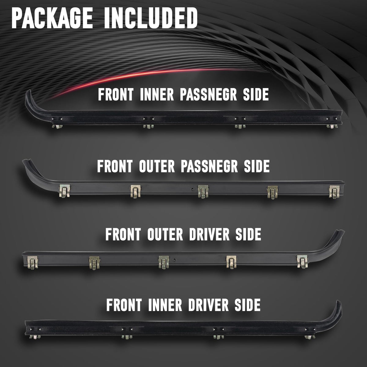 Compatible With 1987-1996 Ford F150 1997 Ford F150 Old Body Style 1987-1997 Ford F250 1987-1997 Ford F350 1987-1996 Ford Bronco Fit for both Front Left & Right Inner & OuterNote: Please check the part number before buying to make sure it fits your carNote: It is recommended to align all the clips of the 4 window seal with the holes to determine the position of each window seal before installation.Note: There is a tough steel bar in the curved part. If there is some disobedience, it can be knocked down with a rubber hammer, which can be corrected, or wrapped in a towel with a wooden stick and knocked down.About Us Our products are 100% brand new quality products, welcome to buy. With our best products and best services, we believe this will be a pleasant shopping experience. We care about our valued customers and hope to establish a long-term business relationship with you, so please help us do better.Quality Assurance 1. Each item has been factory tested and meets or exceeds oem specifications. 2. Provide lifetime warranty service. If you are not satisfied with the product or the product has quality problems, you can contact us at any time, we will provide you with a satisfactory answer and solve the after-sales problem for you.We attach great importance to quality and service. If you have any questions about the project or our services, please contact us first. We value your feedback, so we will strive to answer all inquiries within 24 hours.