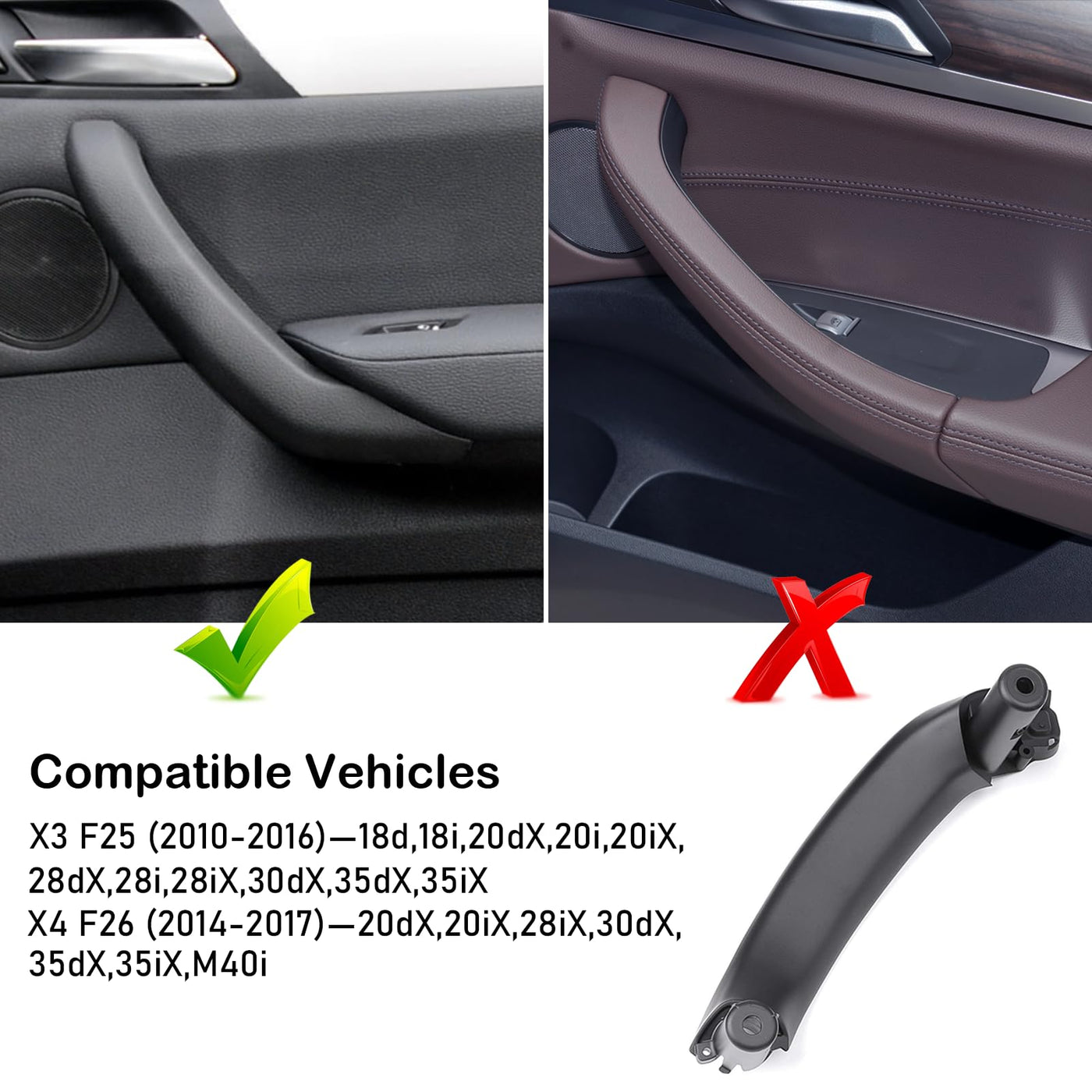 Q: Is this door pull handle compatible with my BMW X3 or X4?A: Yes, this door pull handle is specifically designed for BMW X3 Series (F25 2010-2016) and BMW X4 Series (F26 2014-2017). It fits perfectly for models including X3 F25 18d, 18i, 20dX, and X4 F26 20dX, among others.