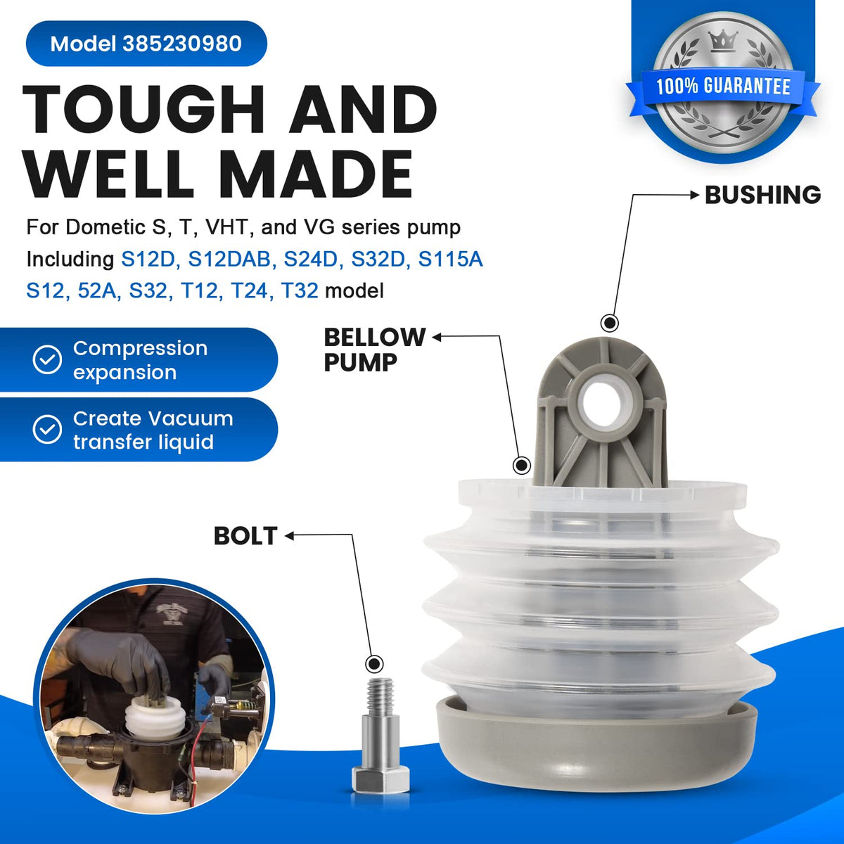 Q: What vacuum pump models are compatible with this kit?A: This kit is compatible with all Dometic S, T, J, VHT, and VG series vacuum pumps, ensuring a perfect fit for your specific model.