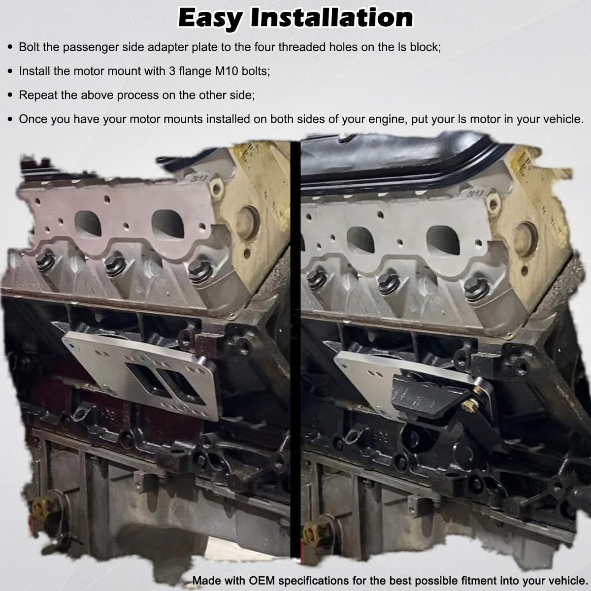 Q: Can I install LS engines into my vehicle with these motor mounts?A: Yes, these adjustable motor mounts allow for the installation of LS-based engines into both small block Chevy (SBC) and big block Chevy (BBC) vehicles. They feature four adjustable positions for optimal fitment.