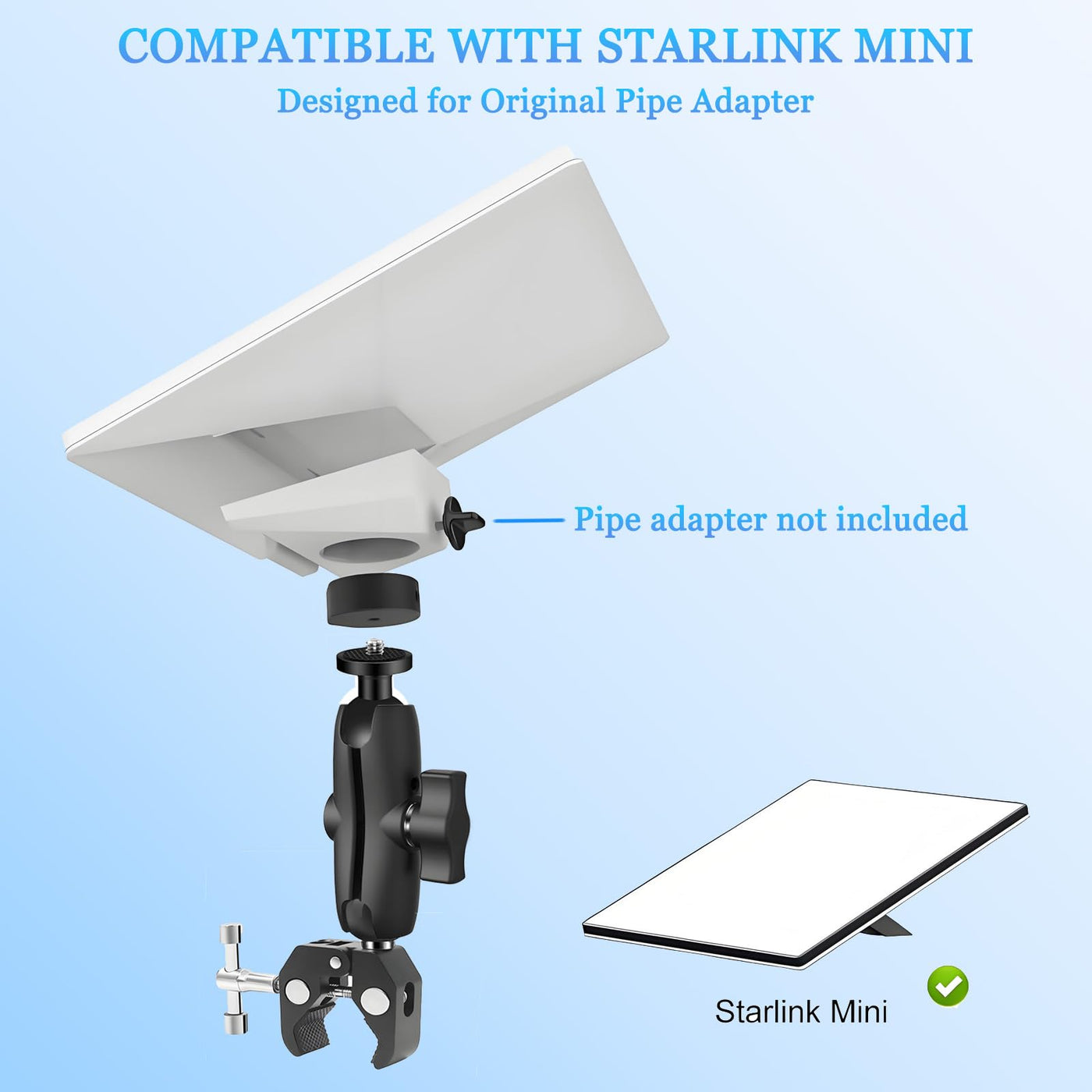 Features: The adapter material is aluminum alloy,CNC machining ensures precise dimensions, exquisite products, and a specially designed hole on the side, Thumbscrew tightens down for a secure fit,Accurately matched with the starlink mini original pipe adapter Wide Compatibility: Multi-Function dual ball head comes with clamps lock the clamps to the RV/motorcycle/Car luggage rack/yacht/ roofs/rod/tube/table/frame with the locking knob; no drilling required. Adjustable angle: Both the upper and lower parts of the bracket can adjust the angle, and your Starlink mini can be adjusted to the optimal angle for receiving signals Portable: The product is portable and sturdy, and its size conforms to the design concept of Starlink Mini. You can install and remove it at any time, and even put it in your own pocket. It is very convenient for outdoor or home use We are committed to high-quality, high design level, and highly matched starlink accessories. If you have any product problems, please be sure to contact us and we will help you solve them