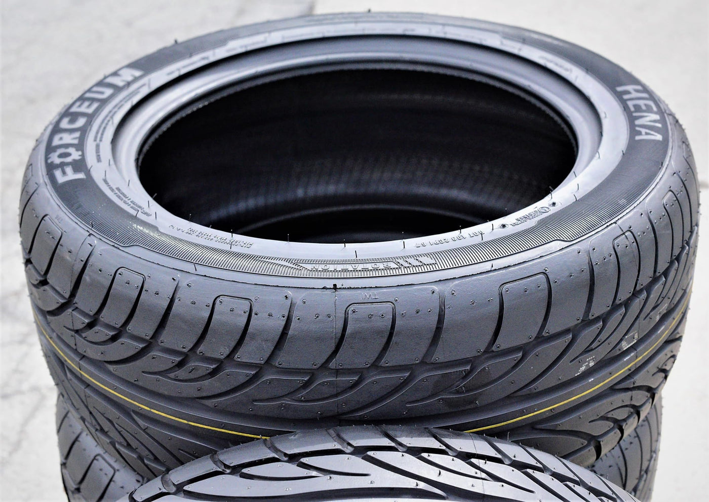 Attention! Due to the size of the tires, Packages might be SEPARATED in the courier facility and not be DELIVERED on the SAME DAY, even though we do ship them together. All tracking information can be checked on courier's website Forceum HenaThe Forceum Hena is a performance and high performance, depending on the speed rating, all season tire manufactured for passenger vehicles. The tread design increases the dry and wet weather traction. The circumferential and special lateral grooves avoid hydroplaning by eliminating water from the footprint. The angled lateral grooves decrease the road noise heard during the drive. The maintained road contact improves the steering and driving stability with the center rib, while the shoulder tread blocks upgrade the cornering and maneuvering ability and power. The Hena extends the tread life and tire usability by preventing irregular wear. FeaturesAll Season Tire - The tread design improves the dry and wet weather traction by increasing the tires road contact summer weather situations.Hydroplaning - The circumferential and lateral grooves, with the 45 degree angles, avoid hydroplaning by dispersing water from the footprint.Quiet Tire - The lateral grooves with the 45 degree angles decrease the road noise levels heard in the cabin while the tires are in motion.Handling - The maintained road contact of the straight center rib improves the steering responsiveness and driving stability greatly.Cornering Ability - The shoulder tread block sequence provides additional biting edges to boost the cornering and maneuvering ability and power.Longer Tread Life - The directional tread pattern improves the tread life length by preventing irregular tread wear formations.