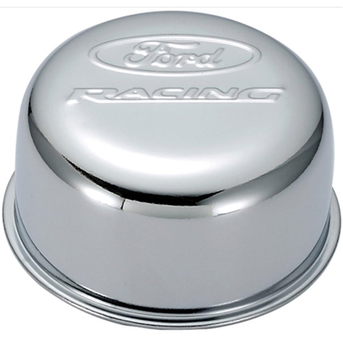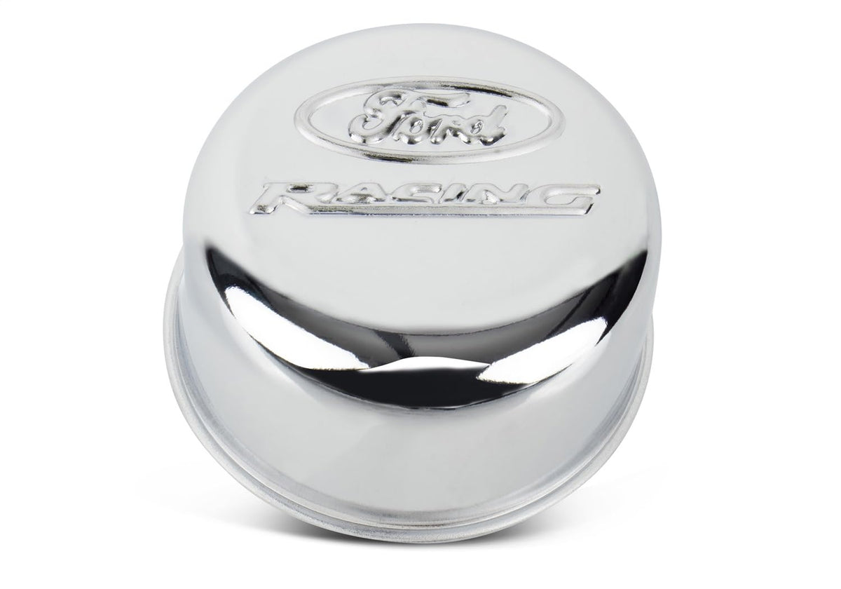 Q: What are the main features of the Ford 302-200 Breather?A: The Ford 302-200 Breather features a twist-on design, a round shape, and is constructed from durable alloy steel with a chrome finish. It prominently displays the Ford Racing logo and is designed for use in various engine applications.