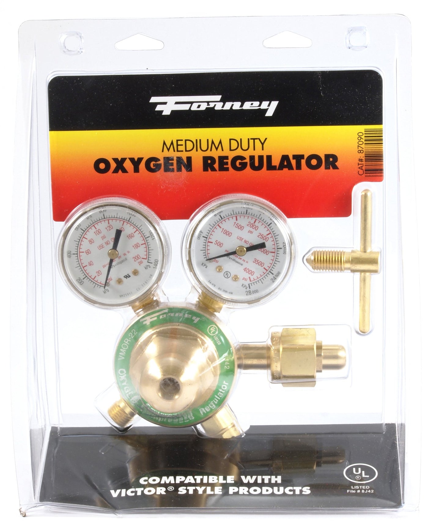 The Forney 87090 Medium Duty Oxygen regulator is a versatile Victor Style Oxygen regulator for medium duty applications. It has a forged brass body and bonnet for maximum strength with a sintered (heat-treated) metal inlet filter to trap impurities. The joints are pressed, not soldered, for easy maintenance. It has easy to read dual scale gauges with nearly unbreakable screw-on lenses. It also includes a safety relief valve for safe operation. This regulator is a replacement used in Forney 01705, 'shop flame II' And 01707 'deluxe' Oxy-acetylene welding kits and will work with similar Victor Style torch sets. Forney Industries is one of America's longest operating family-owned metal working product companies. Founded in 1932, Forney offers more than 5, 000 products for the hardware, automotive, farm and ranch and Do-It-Yourself markets. If you've got metal working questions, we've got answers. We're committed to your success regardless of location size or needs. This regulator uses a CGA540 fitting. Claims for warranty must be made within 90 days of the date of purchase. Proof of purchase required. This warranty does not cover any product that has been subject to misuse, neglect, negligence or accident, or that has been used in any way contrary to the purpose intended.