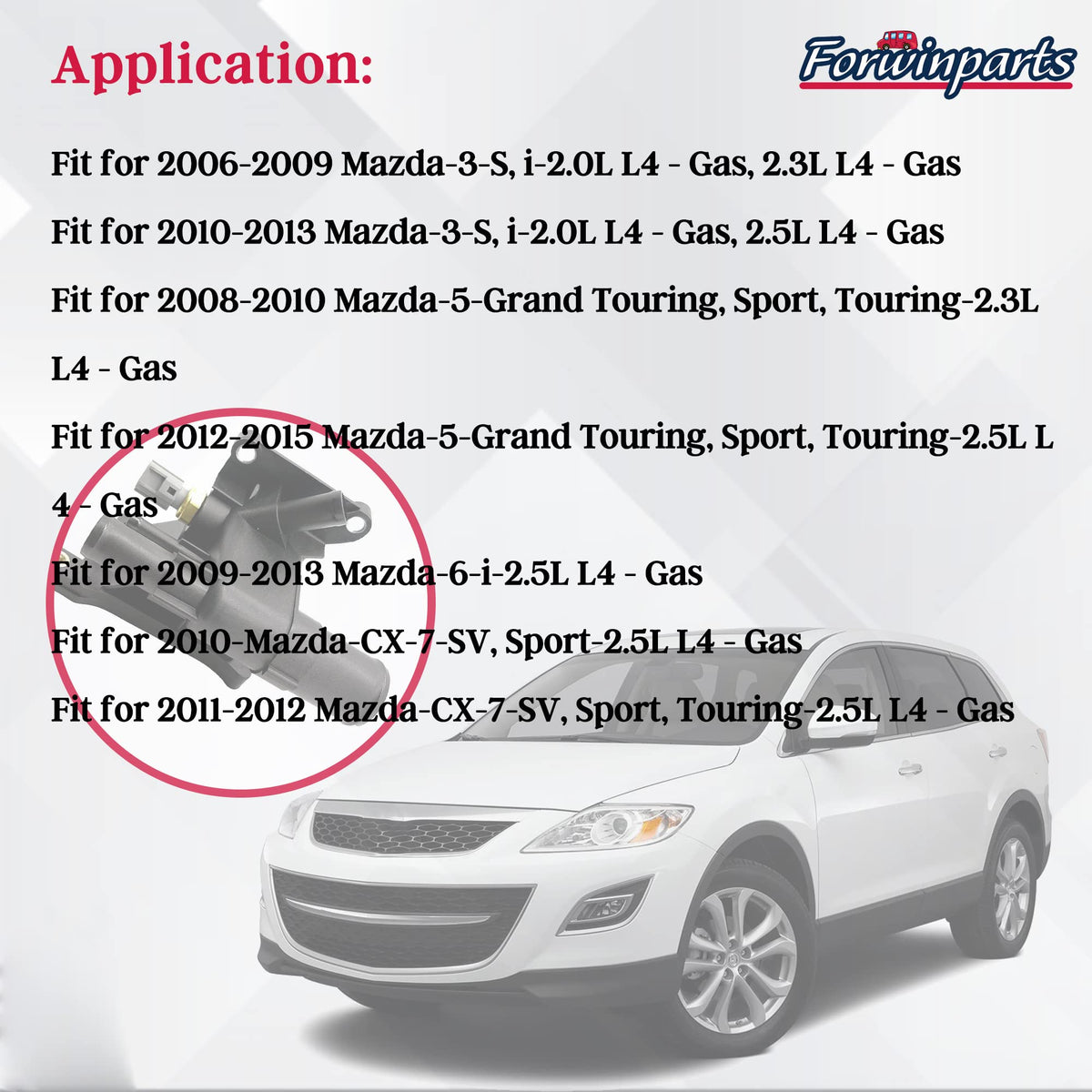 Q: What vehicles are compatible with the Forwinparts LF941517Z water outlet housing gasket?A: The Forwinparts LF941517Z water outlet housing gasket is compatible with various Mazda models including the 2006-2015 Mazda 3 (2.0L, 2.3L, 2.5L), Mazda 5 (2008-2015, 2.3L, 2.5L), Mazda 6 (2009-2013, 2.5L), and Mazda CX-7 (2010-2012, 2.5L). Please check the specific model year and engine size to ensure proper fit.