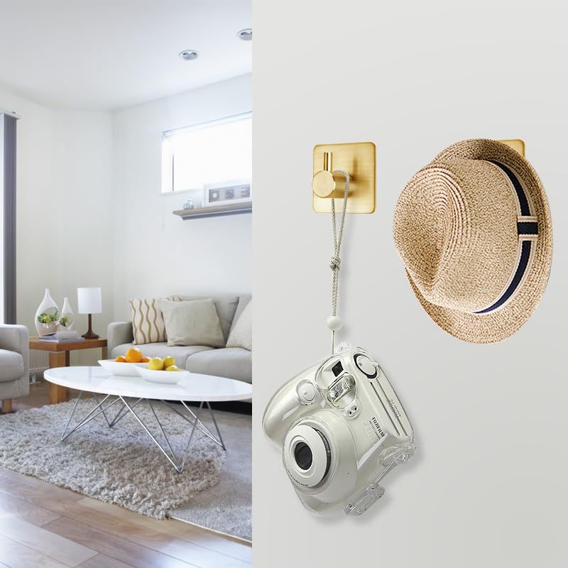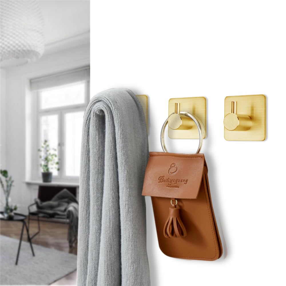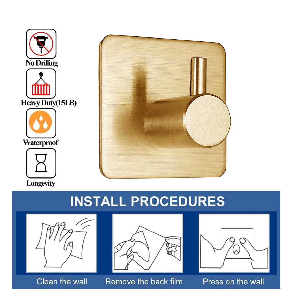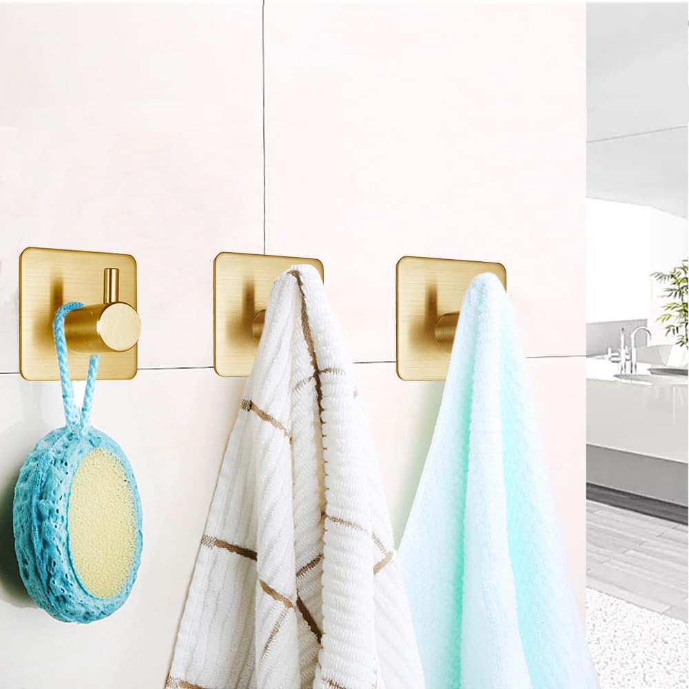 Fotosnow Matte Brushed Gold Adhesive Door Hooks 15Lbs (Max) Sticky Hooks For Hanging Towels, Coat, Cloth, Purse, Hat, Key Self-Adhesive Towel Holder For Shower Kitchen Bathroom