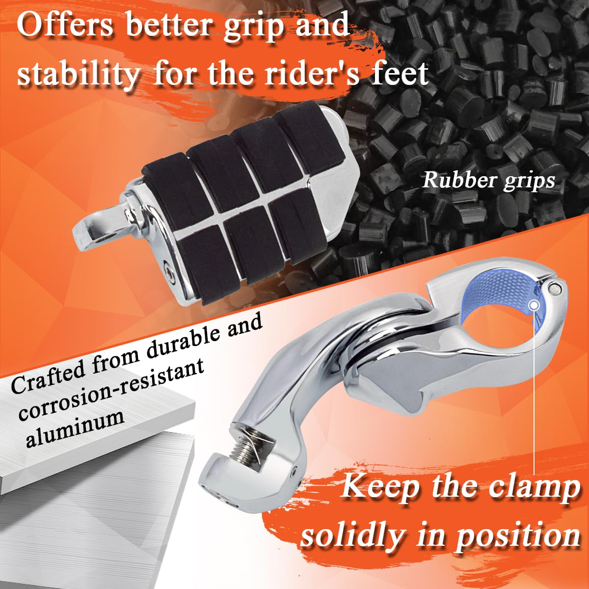 Q: Do the footpegs provide good grip in wet conditions?A: Yes, the footpegs feature a textured surface that provides a firm grip, even in wet or slippery conditions. This design enhances control and stability while riding, making them a safe choice for various weather conditions.