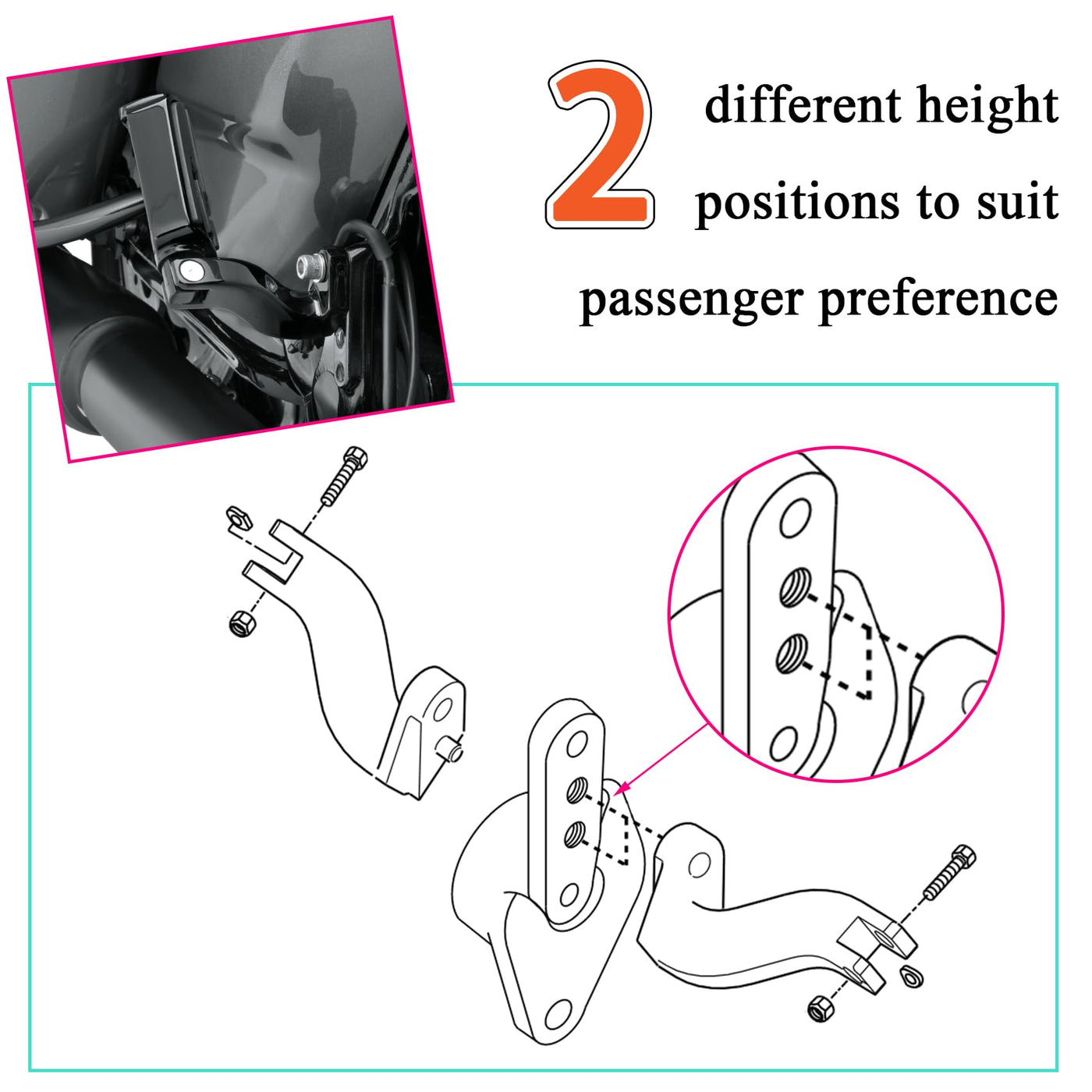 - Q: What features does the FOVPLUE Passenger Footpeg Kit offer for comfort? A: This footpeg kit includes adjustable height positions to suit passenger preferences, 360-degree adjustable and 90-degree foldable footpegs for optimal comfort and control, and rubber grips for a secure hold during rides.