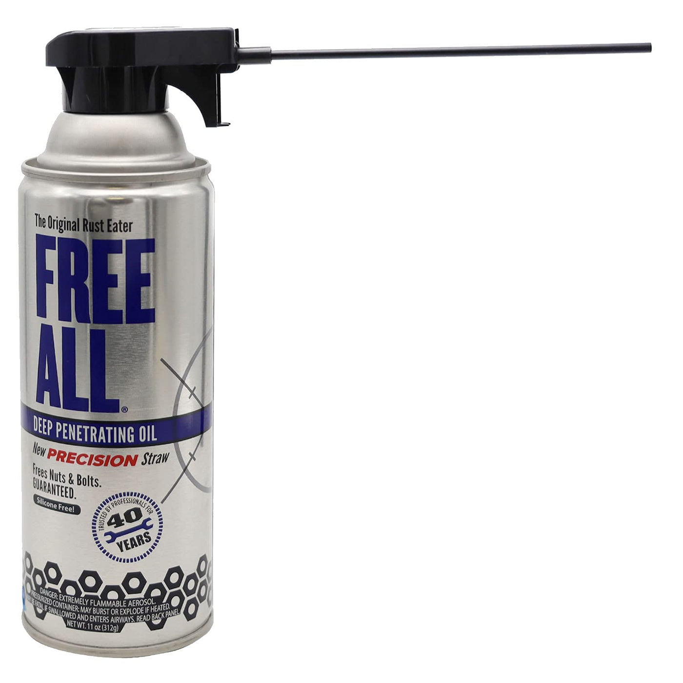 Free All Deep Penetrating Oil Actually Has A Rust Eating Agent In The Penetrating Formula That Not Only Breaks Down Rust But Also Helps To Loosen And Dissolve Build-Ups Away. Our New Precision Straw Allows You To Spray Penetrating Oil In A Wide-Aim Nozzle Or Through The Straw-Nozzle For Pinpoint Precision. This Penetrating Oil Works So Well You Will Need To Use Less Force To Loosen Any Stubborn Or Frozen Bolts. Free All'S Rust Eater Means No More Torching, Drilling, Hammering Or Chiseling Needed. Free All Oil Is Also Silicone-Free So It Is Specially Formulated To Be Used In A Variety Of Applications From Automotive, Plumbing, Marine, Maintenance Or Industrial Applications. Made In The Usa.