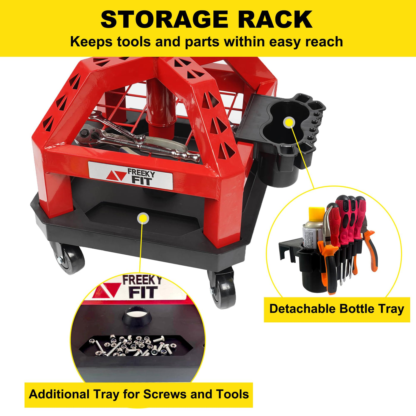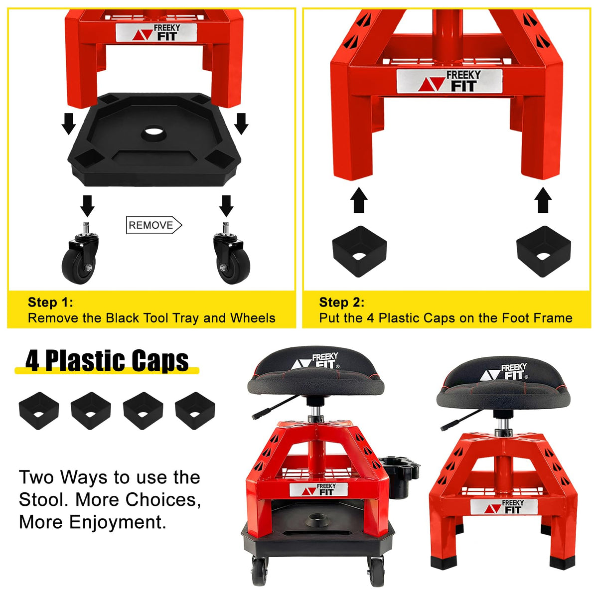 FreekyFit Rolling Shop Stool for Garage with Casters, DO02-Adjustable Height 360 Swivel Shop Seat with Tool Tray Storage, 330 LB