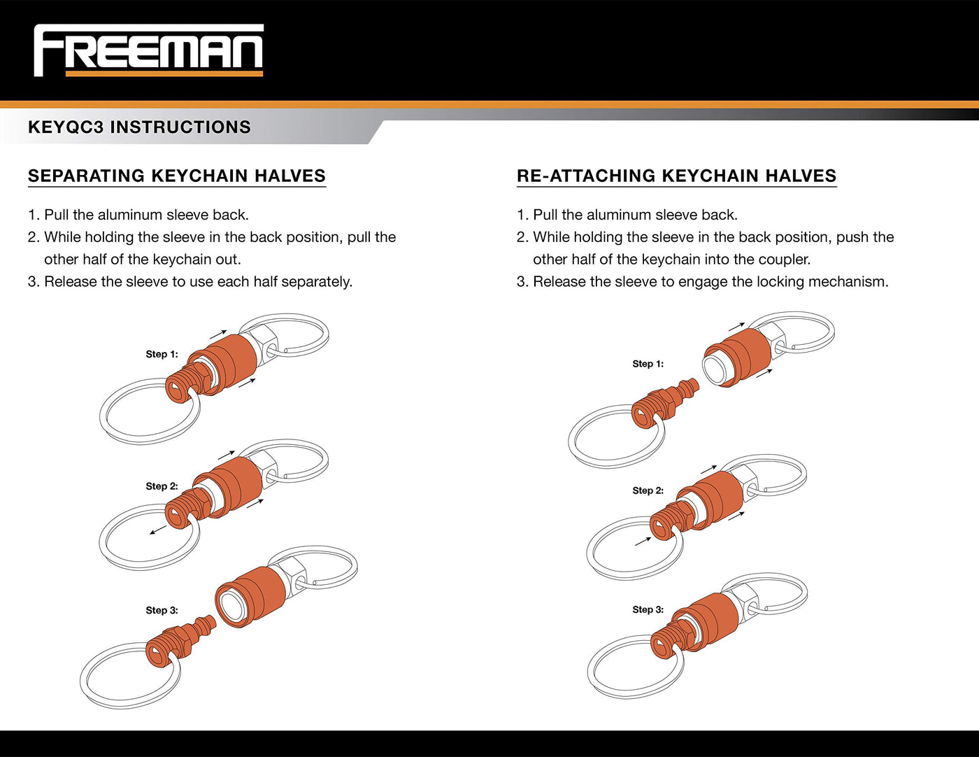 The Freeman detachable key chain is designed to easily separate house, business, and car keys so you can leave certain keys with friends or family, give just your car key to valets or mechanics, take only the essentials to the gym, or even pre-heat your cold car while still being able to lock your front door before you leave. Pull back the red metal coupler sleeve when you want to separate or re-attach the two halves, which only separate when needed thanks to the ball-bearing design. The compact size and all-metal construction provide durability without taking up any extra space in your bag or pockets. Each side includes a 1'' split ring to secure all of your assorted keys, badge IDs, membership cards, or other accessories including pocket knives, USB drives, bottle openers, small flashlights, and more. This set of 3 keychains is a must-have to keep keys safe and organized, and is a practical addition to your everyday routine.