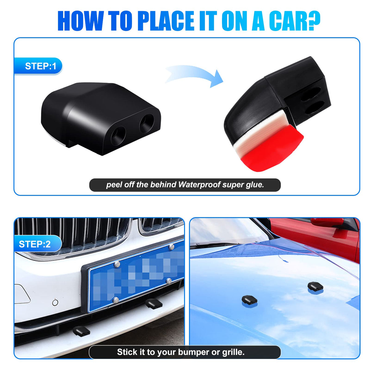 Q: How easy is it to install the deer whistles on my car?A: Installation is simple and requires no special tools. Just peel off the backing tape and stick the whistles to a flat surface on your car, such as the grill or front bumper, ensuring that the larger end is facing forward.