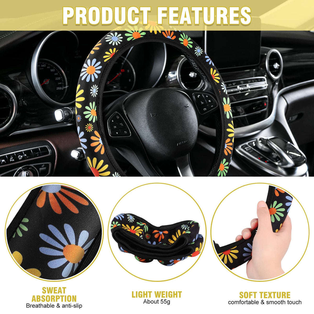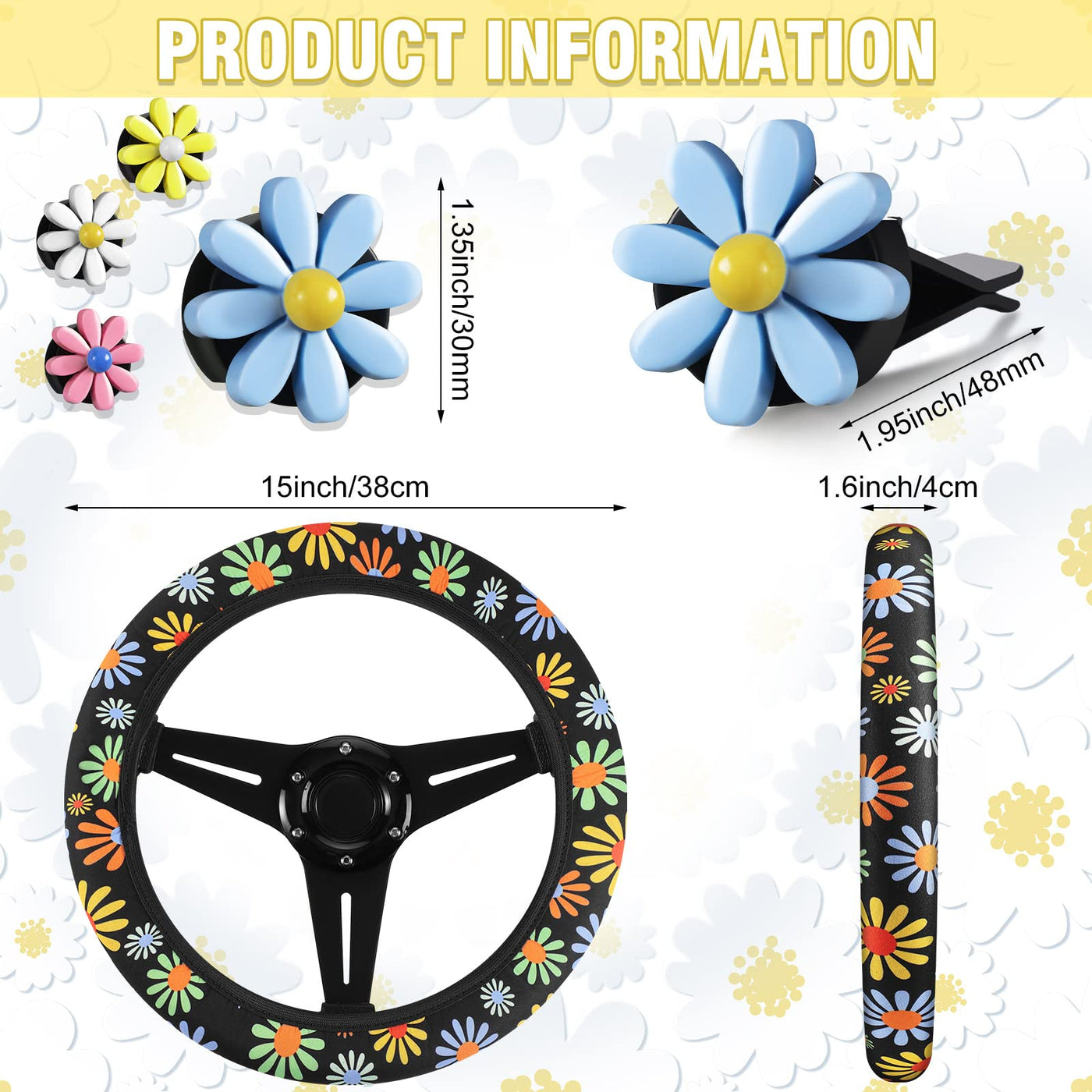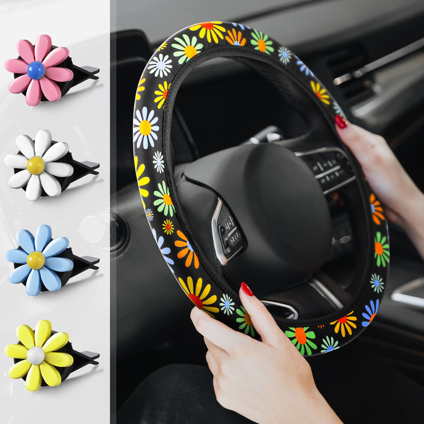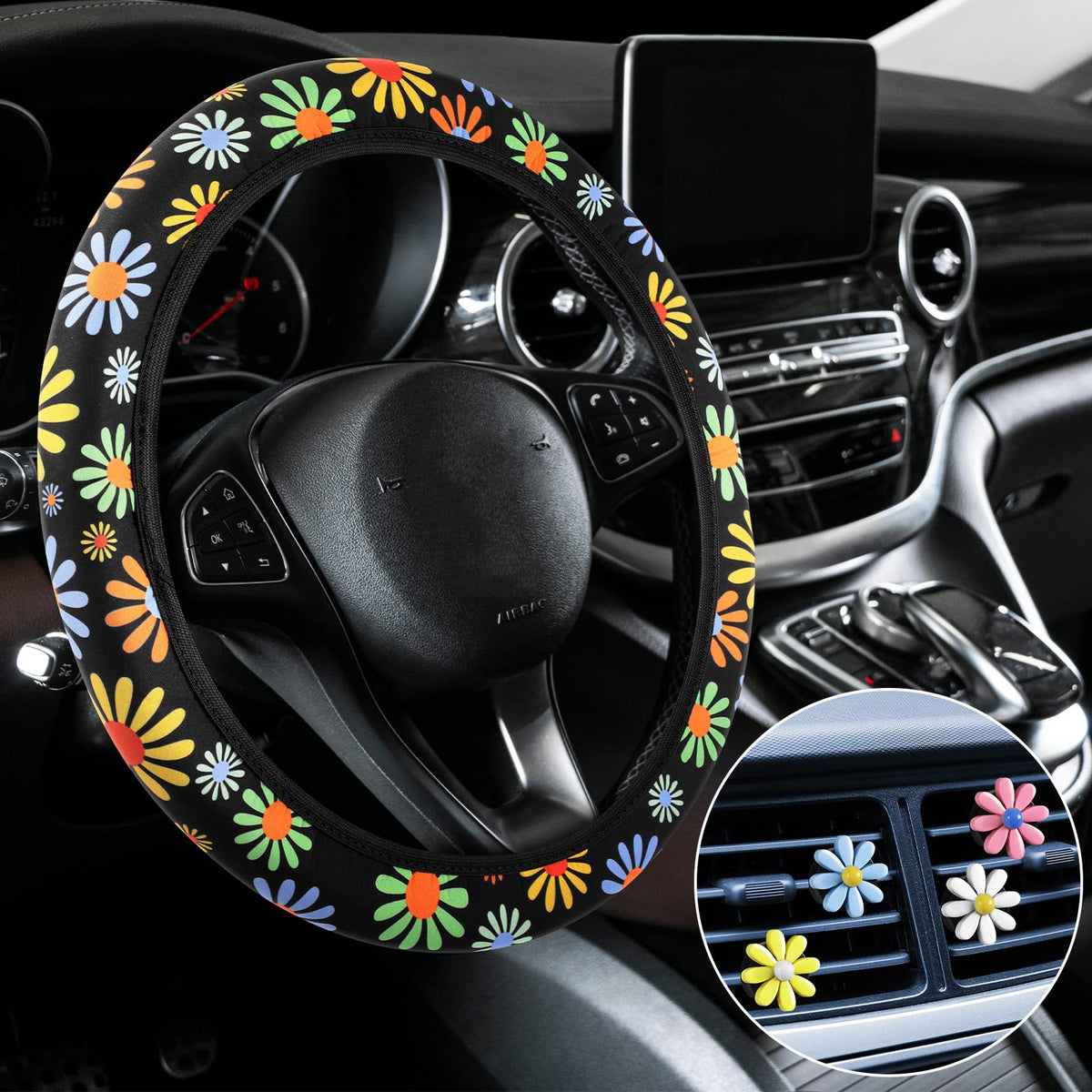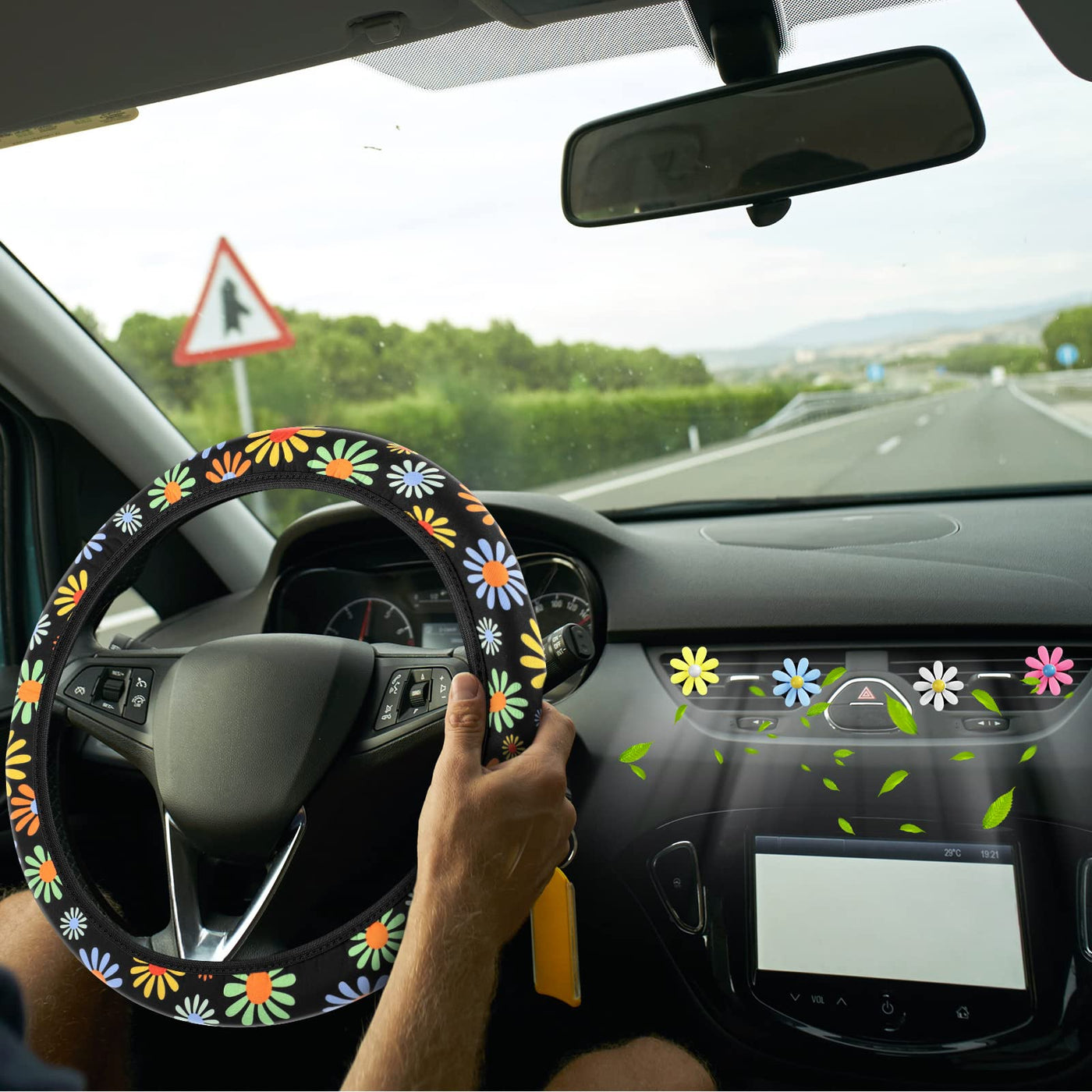 Frienda 5 Pcs Hippie Car Accessories Set Hippie Flower Steering Wheel Cover with Daisy Air Vent Clips Universal Boho Floral Car Accessories for Women Men Girls
