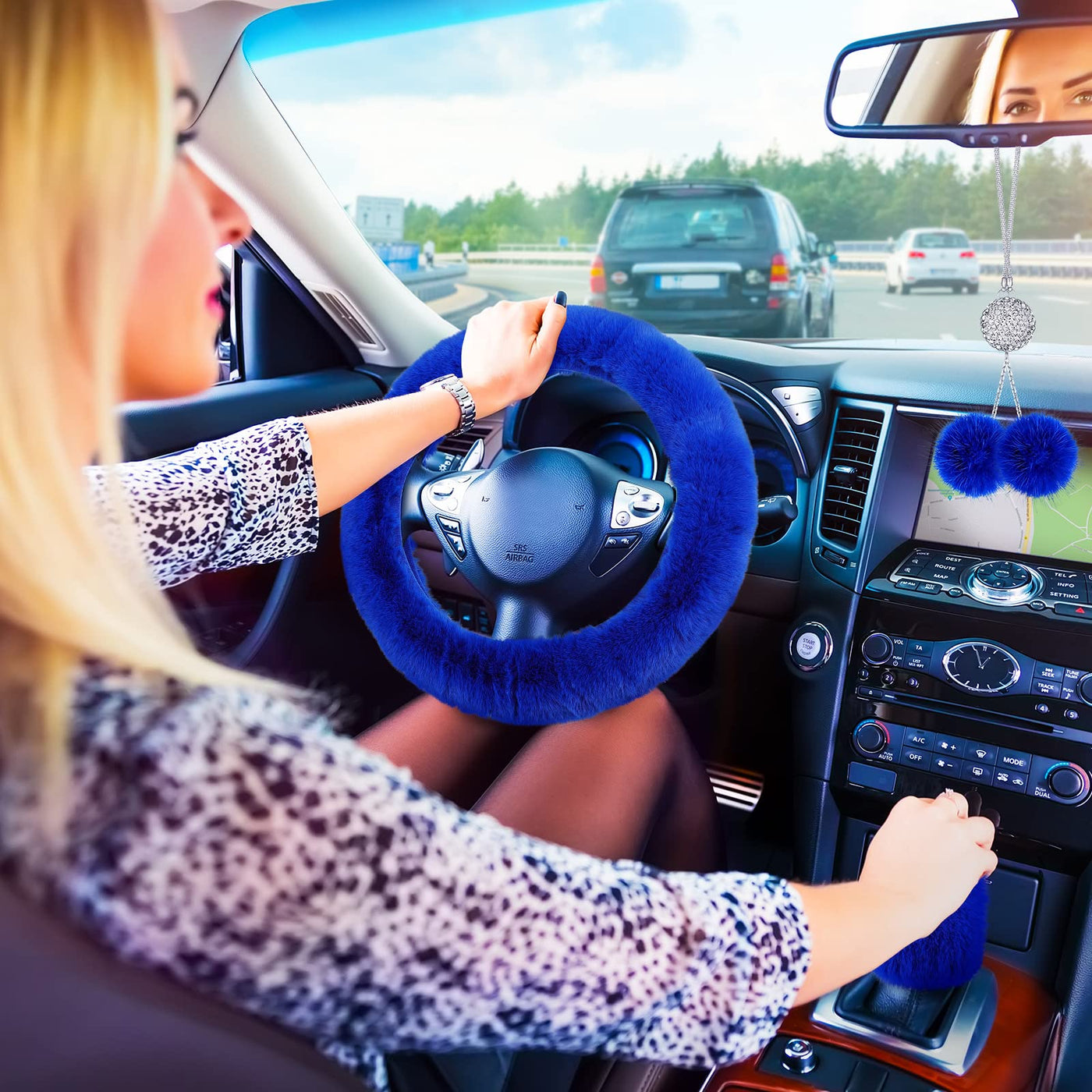 Frienda 6 Pieces Fluffy Car Accessories Set Bling Fluffy Steering Wheel Cover Soft Fuzz Handbrake Gear Shift Cover Bling Mirror