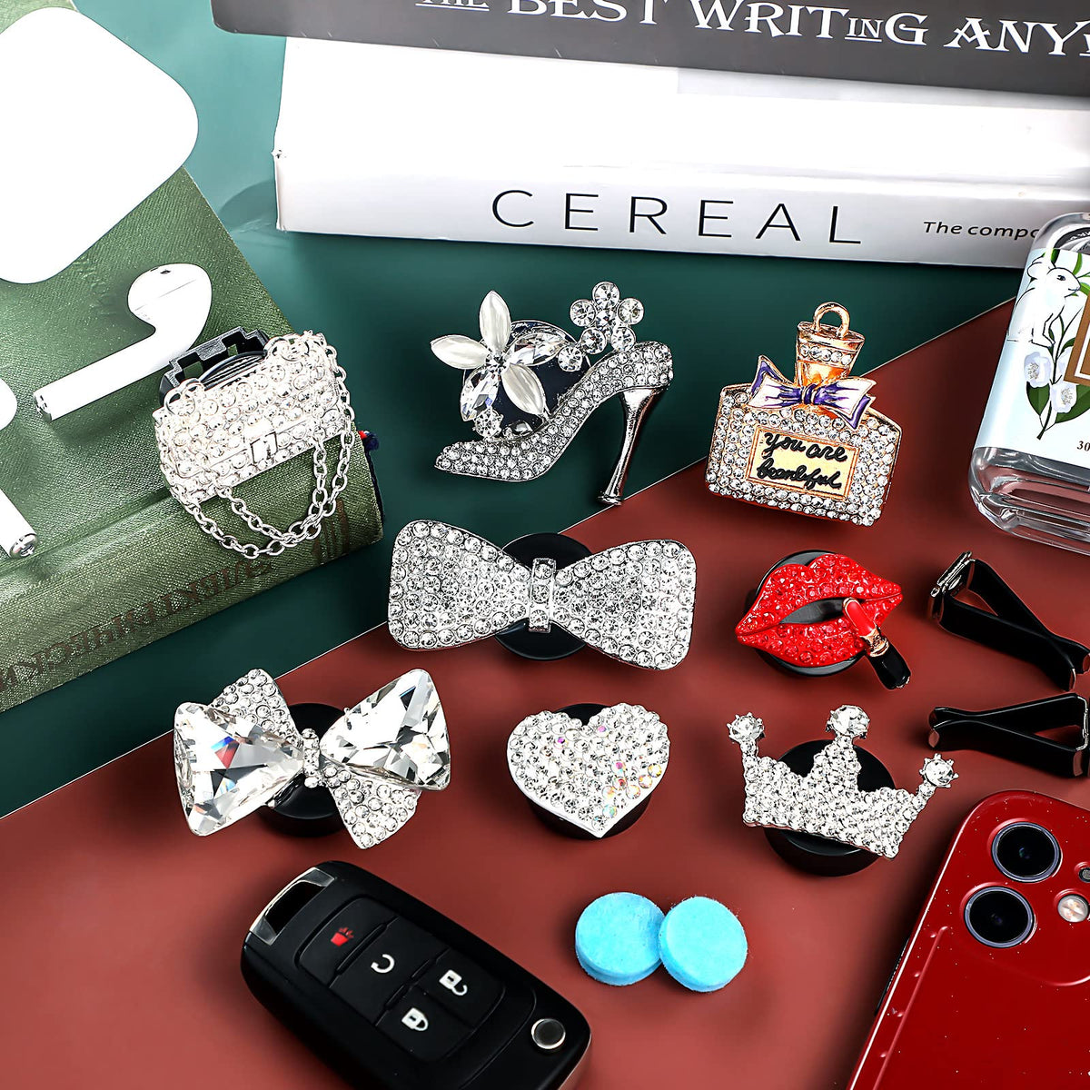 Features: Long-lasting fragrance experience: The perfume clip can effectively dissipate peculiar smell, help bring fresh and fragrant air, reduce pressure, alleviate driving fatigue, not only add vitality to the interior of the car, but also add happiness and romantic atmosphere for each driving trip. Stylish and attractive: Exquisite and bling outlook with rhinestone gives you and your car a stylish feeling, which will make your car more eye-catching. Specifications: Material: alloy Color: as pictures shown Size: as pictures shown Package includes: 8 x Car freshener clips Notes: Manual measurement, please allow slight errors on size. The color may exist slight difference due to different screen displays.