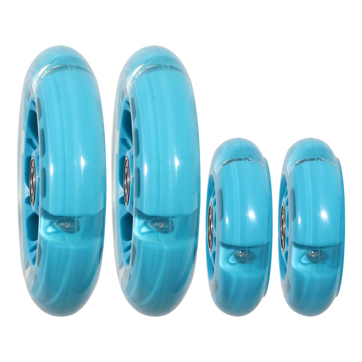 ?Premium Material?Made of Polyurethane, Durable to use, Performance well | ?Specification?Front: Out dia Approx. 120mm(4.7inch), Wheel hub thinkness:24mm(0.94inch), Thickend PU: 28mm(1.1inch); Rear: Out dia Approx. 80mm(3.2inch), Standard wheel thinkness:24mm(0.94inch) | ?Eazy to Install? Pre-installed 608RS bearings and Spacers, Enjoy a smooth ride | ?Moderate Hardness & Illuminating ? 83A Durometer, Comfortab to Ride,Require no battery, Powered by magnetic core, Flashing when riding cool at the dark, Explore more fun for kids. | ?Widely Application?Package Included 4 Pieces(2*Front and 2*Rear), For 3-Wheeled Kid Push Scooter