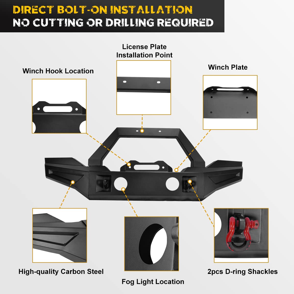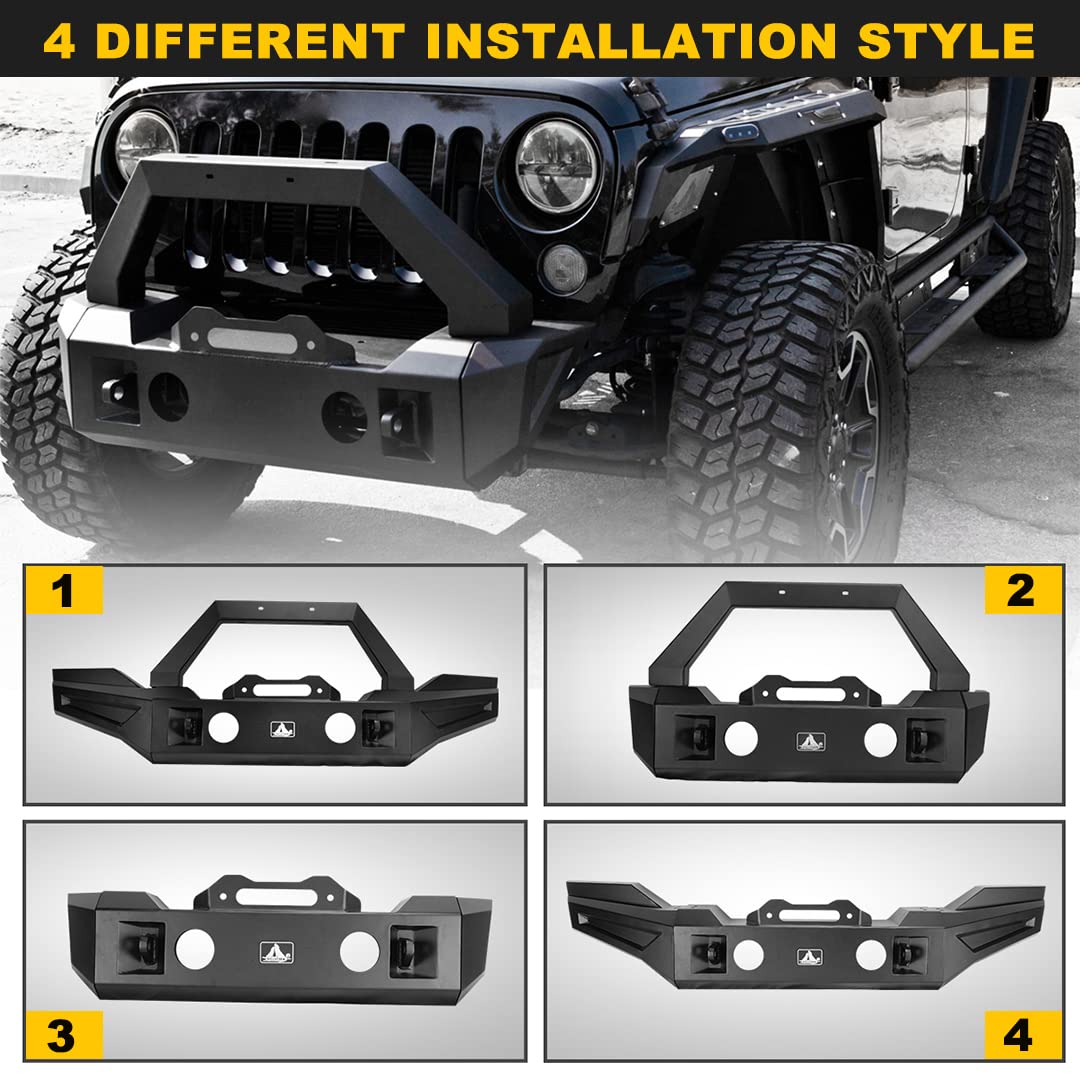 Q: How difficult is the installation process for this bumper?A: The installation is designed to be easy with a direct bolt-on process that requires no drilling or modifications to your Jeep. All necessary hardware and installation instructions are included.