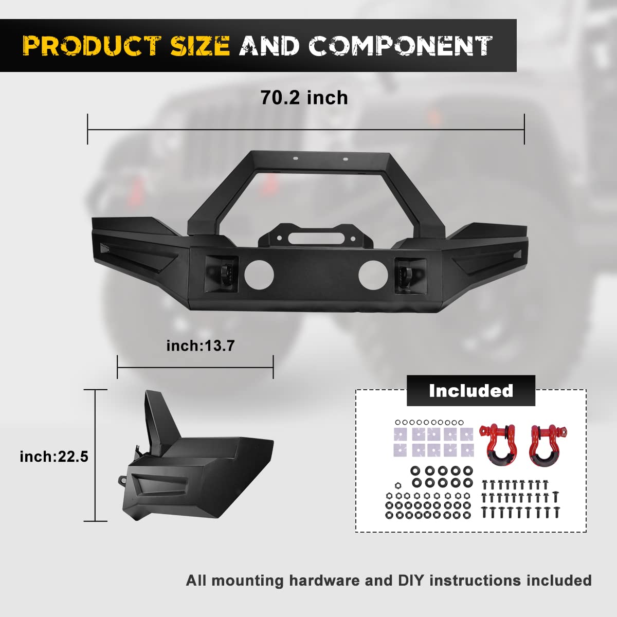 Front Bumper For Jeep 2007-2018 Wrangler Jk & Unlimited 2/4 Doors With Fog Light Holes, Bumper Not Only Makes Your Wrangler Look Fresh & Tougher But Also Protects It In Collisions.??For Jeep Wrangler Jk/Jku 2-Door & 4-Door Modelsfits For 2007, 2008, 2009, 2010, 2011, 2012, 2013, 2014, 2015, 2016, 2017, 2018 Wrangler Jk/Jku 2-Door & 4-Door All Models??For Jeep Wrangler Jl/Jlu 2-Door & 4-Door Modelsfits For 2018, 2019, 2020, 2021, 2022 2023 Wrangler Jl/Jlu 2-Door & 4-Door All Models??For Jeep Gladiator Jt 2-Door & 4-Door Modelsfor Jeep 2019 2020 2021 2022 2023 Gladiator Jtnote: Please Make Sure Your Vehicle On Our Match List. We Are Not Only A Seller, But Also The Manufacturer Of Vehicle Accessories For Many Years.Include The Exterior Accessories And Interior Accessories, If You Are Not Sure Whether The Bumper Will Fit, Please Contact Us Before Purchasing.??Specifications:Condition:100% Original Packagetype: Jk Front Bumper Protectorprimary Color: Blackmaterial: Alloy Steelsurface Finish: Black Powder Coated Steelinstallation-Type: Direct Bolt-On Withno Drilling Requiredattachment Type: Bolts, Rivets, Screwsplacement On Vehicle: Frontfront Bumper Size: 178.4 X 34.9 X 57.2 Cm / 70.2 X 13.7 X 22.5 Inch (Lxwxh)Weight: 93 Lbs??Package Includes:1X Front Bumper1X Set Of Mounting Accessories??Oem Fog Light Housingour Bumpers Relocate The Stock Fog Lights To Widen Their Field Of Vision. Pre-Machined Attachment Points Ensure Flush And Simple Installation Of Pre-Existing Oem Size Fog Light Assemblies. (Fog Lights Not Included).??2X D-Ringshackle Mounts Are Robotic-Welded Onto The Bumper From The Inside And Outside For Maximum Strength. Include 4.75 Ton Capacity D-Rings Are ¾” Diameter, With A 7/8” Diameter Pin, And Can Support Up To 9,000 Lbs.??Easy Bolt-On Installationeasy Bolt-On Install With Product Instruction And Hardware That Come With Bumpers. No Drilling Or Modifications Required To Your Wrangler Jk.??Re-Painted Exclusive Designyou Can Redesign Your Bumper By Repainting To Make It More Exclusive To You And Your Car.Warm Tip: You Have Better Install The Bumper On The Car After The Re-Spray Is Completely Dry.??Faster Servise —— Our Products Are All Shipped From The Us Warehouse, And We Will Choose The Most Suitable And Fastest Express Delivery According To Your Location For You.??Warranty —— We Promise If You Are Not 100% Satisfied With This Product When You Received, You Could Return It And We Will Refund For You. We Warranty This Item For 12 Months From The Date Of Purchase.